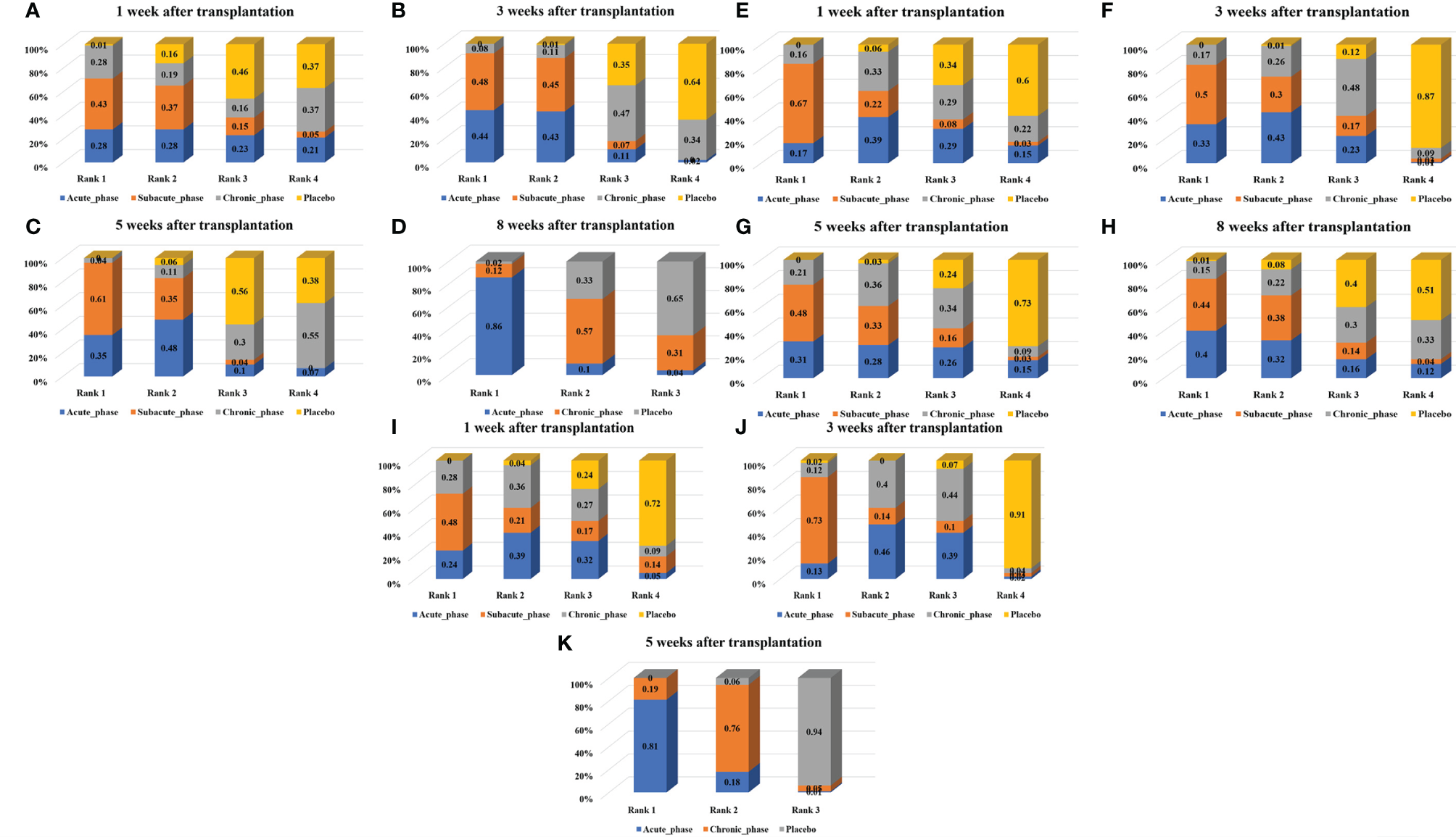 Figure 7 Ranking results of moderate injury. (A–D, results of 1, 3, 5, and 8 weeks of high-dose group; E–H, results of 1, 3, 5, and 8 weeks of moderate-dose group; I–K: results of 1, 3, and 5 weeks of low-dose group).