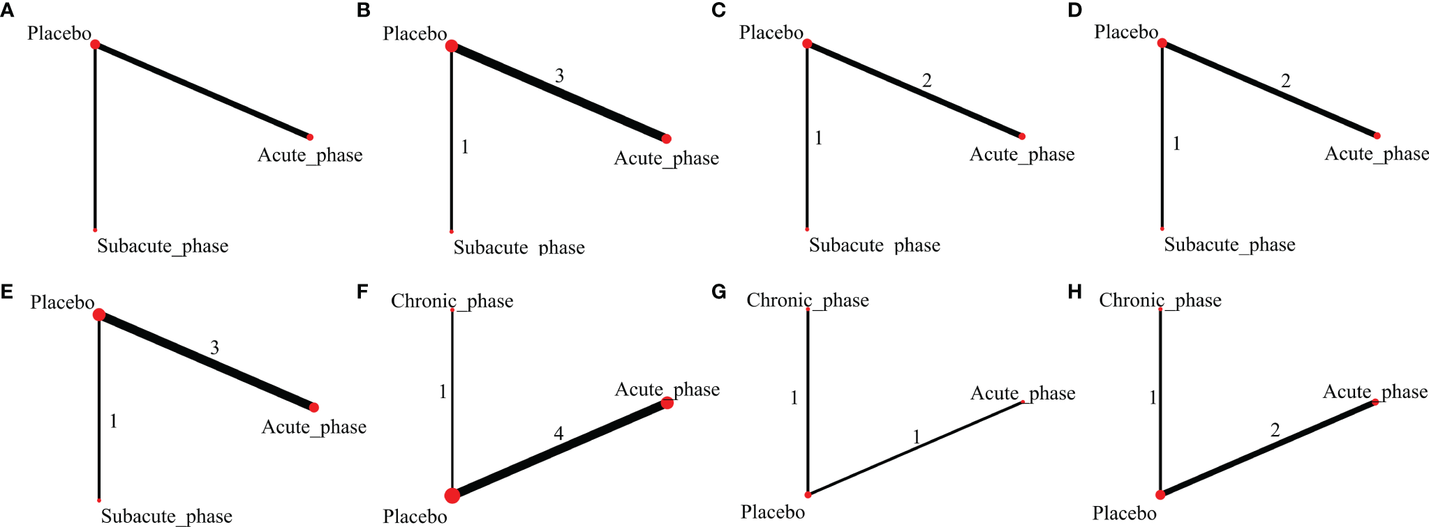 Figure 8 Evidence network plots of severe injury. (A–D, results of 1, 3, 5, and 8 weeks of high-dose group; E–H, results of 1, 3, 5, and 8 weeks of moderate-dose group).