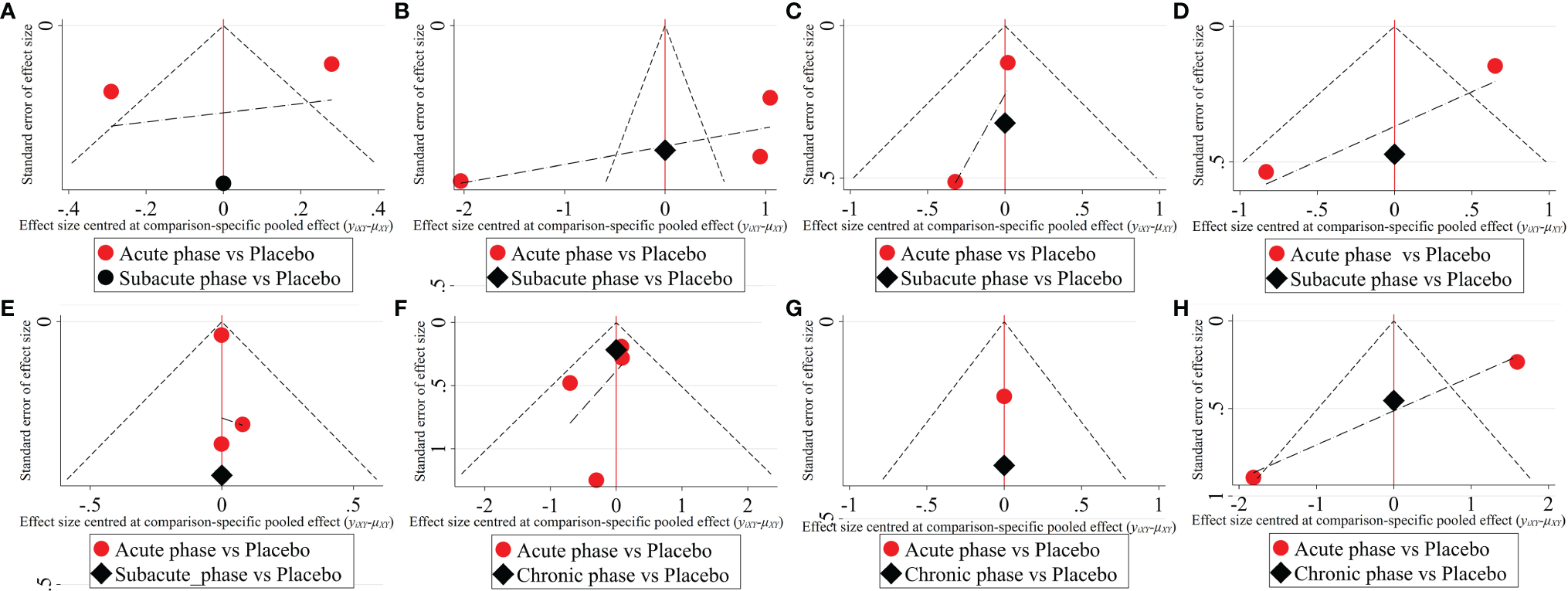 Figure 9 The comparison-corrected funnel plots of severe injury. (A–D, results of 1, 3, 5, and 8 weeks of high-dose group; E–H, results of 1, 3, 5, and 8 weeks of moderate-dose group).