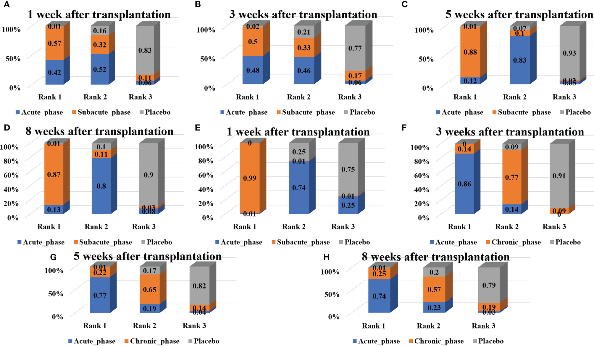 Figure 10 Ranking results of severe injury. (A–D, results of 1, 3, 5, and 8 weeks of high-dose group; E–H, results of 1, 3, 5, and 8 weeks of moderate-dose group).