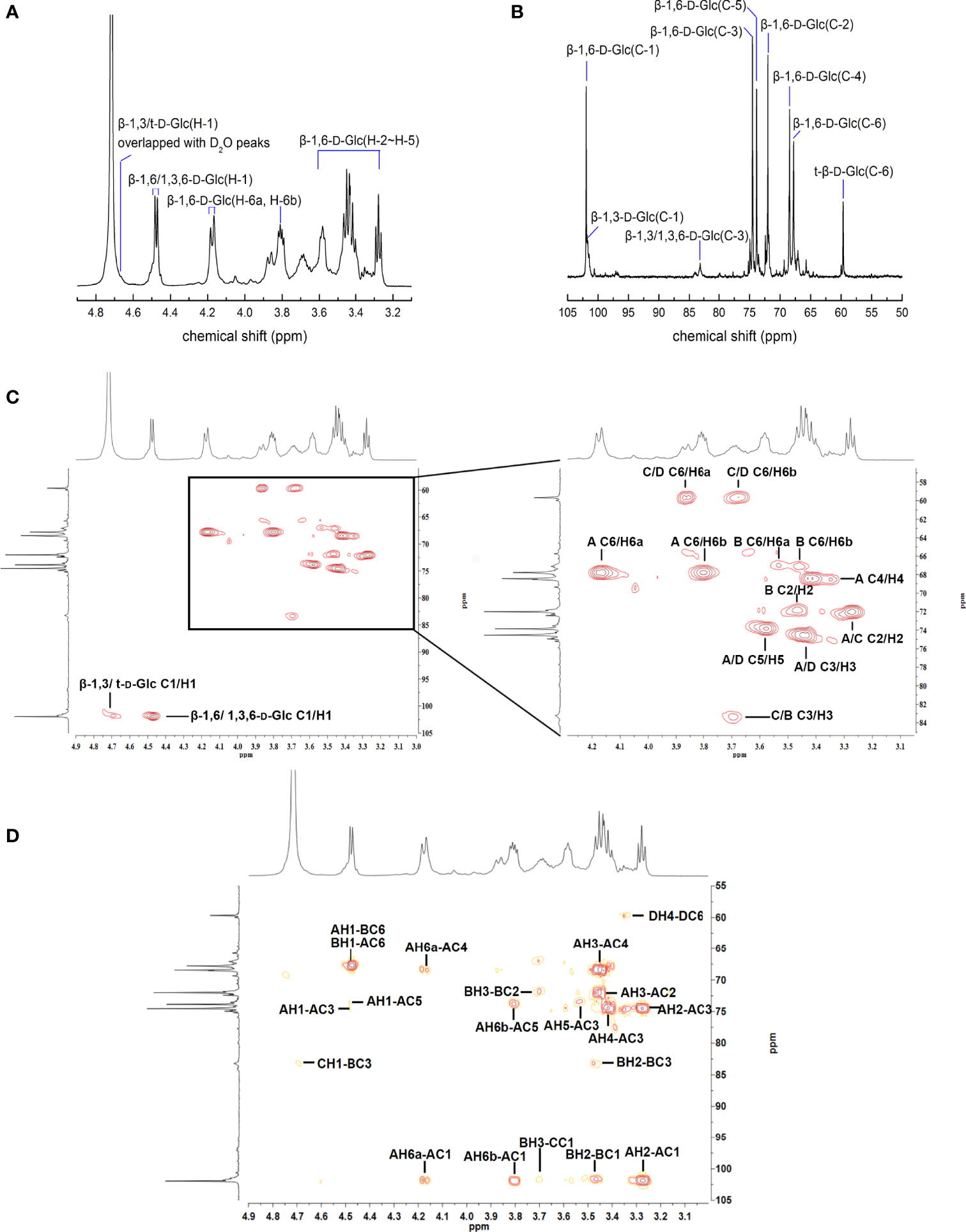 NMR spectra of APEP-A-b. (A) 1H NMR spectrum; (B) 13C NMR spectrum spectrum; (C) HSQC spectrum; (D) HMBC spectrum.