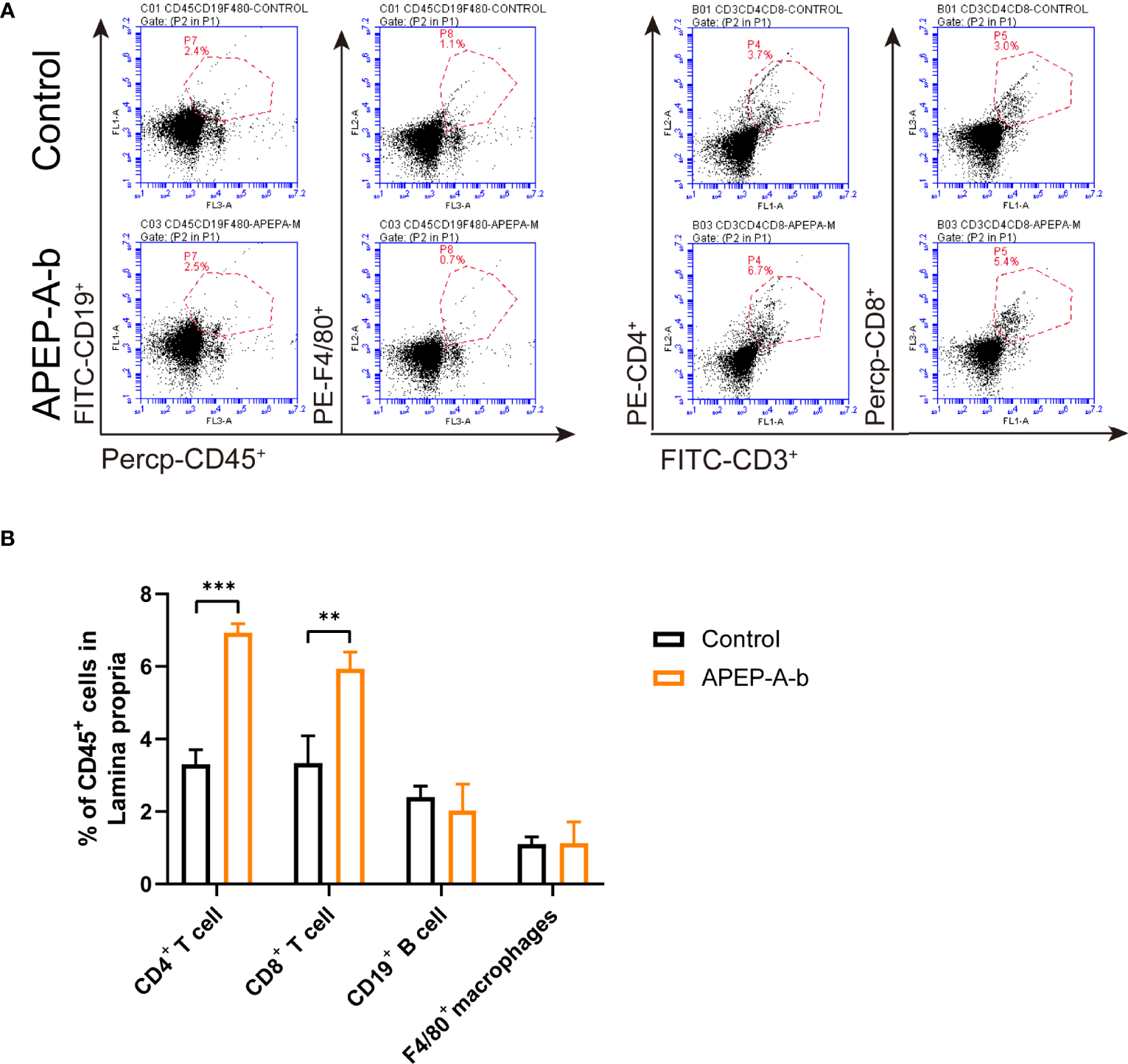 APEP-A-b changed the proportion of immune cells in lamina propria. Flow cytometric analysis of CD4+ T cells (CD45.2+CD3+CD4+), CD8+ T cells (CD45.2+CD3+CD8+), B cells (CD45.2+CD19+), macrophages (CD45.2+F4/80+) and dendritic cells (CD45.2+Ly6G+) in the lamina propria of Control group (upper panels) and APEP-A-b 200 mg/kg·d group (lower panels). Representative dot plots (A) and summary data (B) depict of the frequencies of cell subsets. Data are represented as the means ± SD (n = 6). **P < 0.01 and ***P < 0.001 compared with the Control group.
