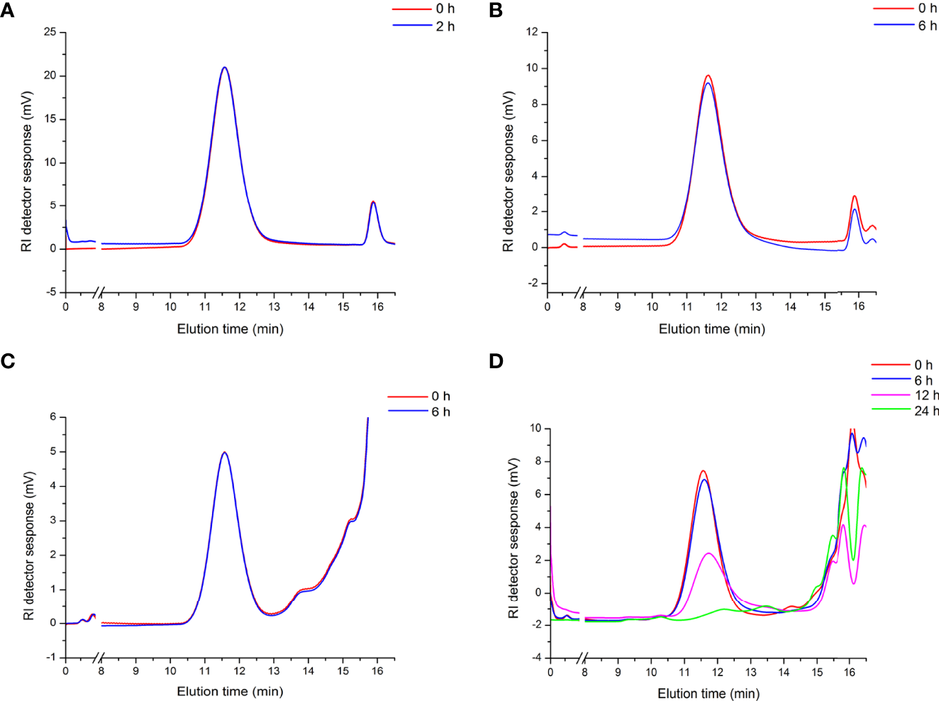 Monosaccharide composition was assessed by using high performance liquid chromatography (HPLC) (32). Briefly, polysaccharide samples (1 mg each) were hydrolyzed at 80°C for 16 h in 1 mL anhydrous methanol containing 2 M HCl and then by using 1 mL 2 M trifluoroacetic acid at 120 °C for 1 h. After derivatization with 1-phenyl-3-methyl-5-pyrazo-lone, derivatives were analyzed by using a Shimadzu HPLC system.