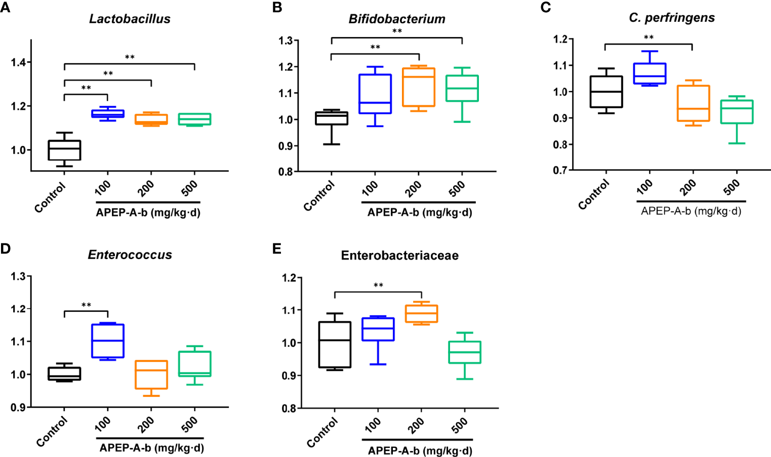 Healthy female C57BL/6 mice (six weeks old) were purchased from Vital River Laboratory Animal Technology Co., Ltd (Beijing, China). Mice were housed under pathogen-free conditions and allowed access to food and water ad libitum. Mice were randomly divided into four groups (n = 6), including Control group, 100 mg/kg·d of APEP-A-b group, 200 mg/kg·d of APEP-A-b group and 500 mg/kg·d of APEP-A-b group. Distilled water or APEP-A-b were intragastrically administered for 14 days. On day 15, mice were sacrificed to assess macrophage phagocytic capacity, lymphocyte proliferation and splenic natural killer (NK) cell activity. Cecal contents were also collected for gut microbiota analysis. All animal experiments were carried out in compliance with the Animal Management Rules of the Ministry of Health of People’s Republic of China and approved by the Animal Care and Use Committee of Northeast Normal University.