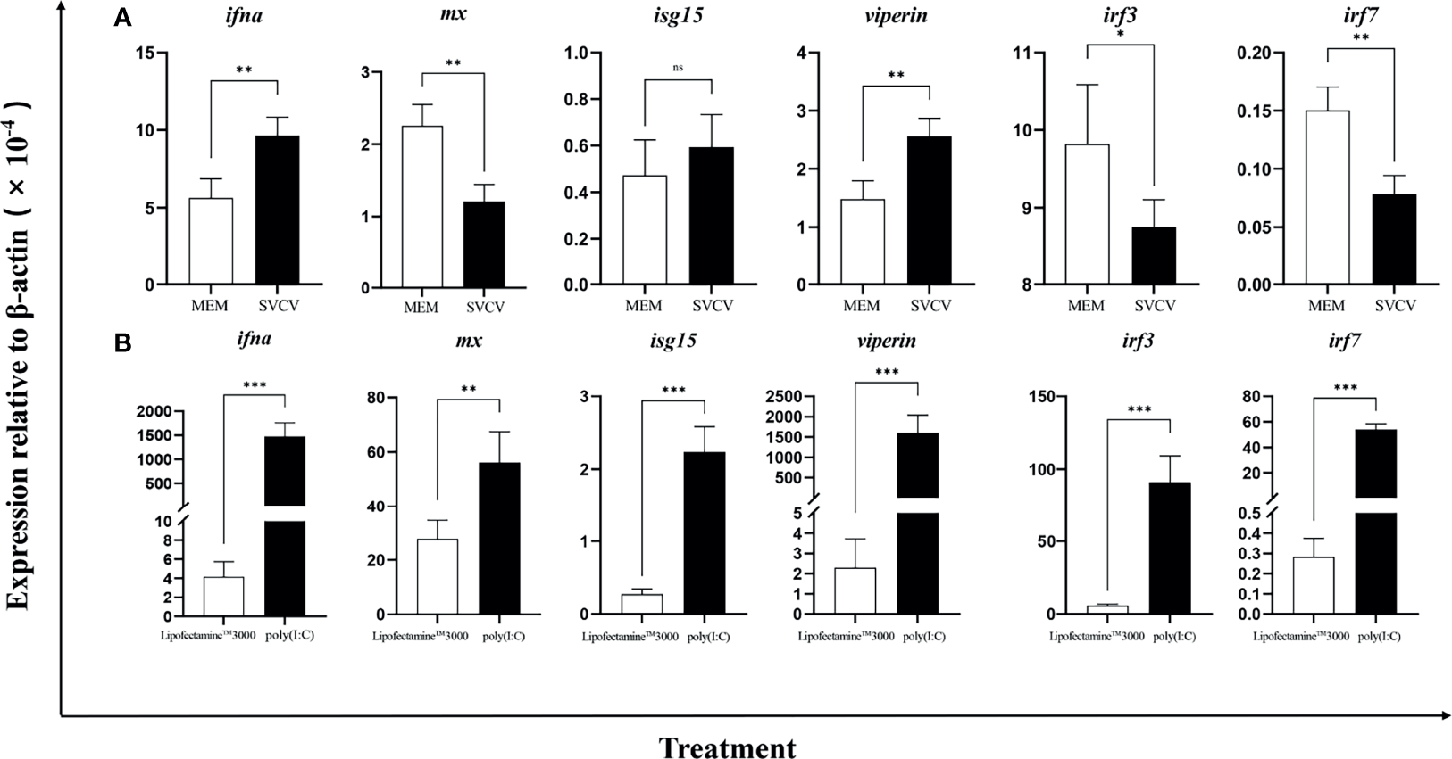 Ifna was induced by SVCV (A) and poly(I:C) (B). The EPC cells were infected with SVCV (MOI = 1) and transfected with poly(I: C). After 24 h, expression of ifna, mx, isg15, viperin, irf3, and irf7 was analyzed by qPCR. Data are shown as mean + SEM (N = 4). *P < 0.05, **P < 0.01, or ***P < 0.001 is considered significant. ns, no significant difference.