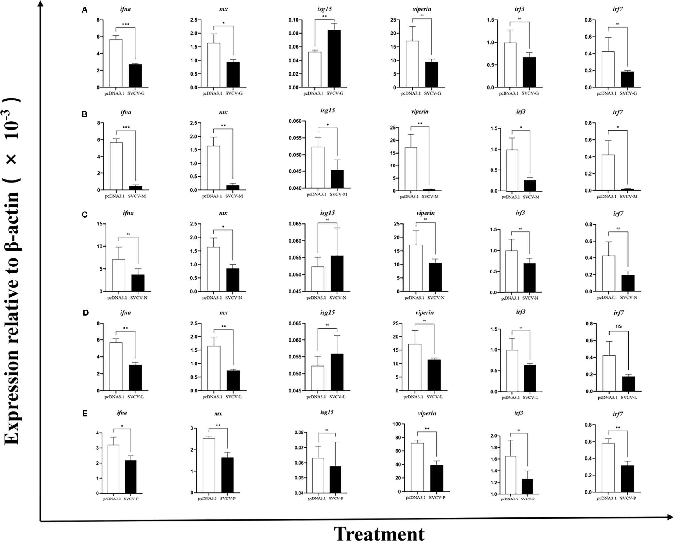 Overexpression of viral proteins downregulates CiIFNa expression. The EPC cells were transfected with plasmids expressing SVCV-G (A), SVCV-M (B), SVCV-N (C), SVCV-L (D) or SVCV-P (E). After 24 h, the expression of ifna, mx, isg15, viperin, irf3, and irf7 was analyzed by qPCR. Data are shown as mean + SEM (N = 4). *P < 0.05, **P < 0.01, or ***P < 0.001 is considered significant. ns, no significant difference.