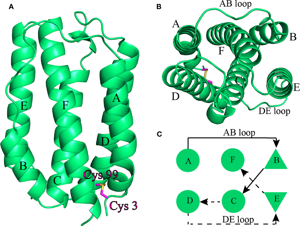 The crystal structure of CiIFNa was determined at 1.58 Å resolution with space group C121 by molecular replacement. The final refinement of the structure generated Rwork/Rfree factors of 0.1799/0.2251. Details of data collection, phasing, and refinement are given in Table 2. In this structure, only one molecular was found. As expected, the structure reveals a typical type I ifn architecture of 6 structural elements, denoted A through F (Figure 3). The helices A, C, D, and F form an anti-parallel four-helix bundle, which are arranged in an up-up-down-down orientation. The helix F is straight, which is the hallmark of type I ifn (15). One disulfide bond formed by Cys3-Cys99 is present in the CiIFNa, linking the N terminal region with helix D, and is analogous to the disulfides found in other vertebrates’ type I ifn (15).