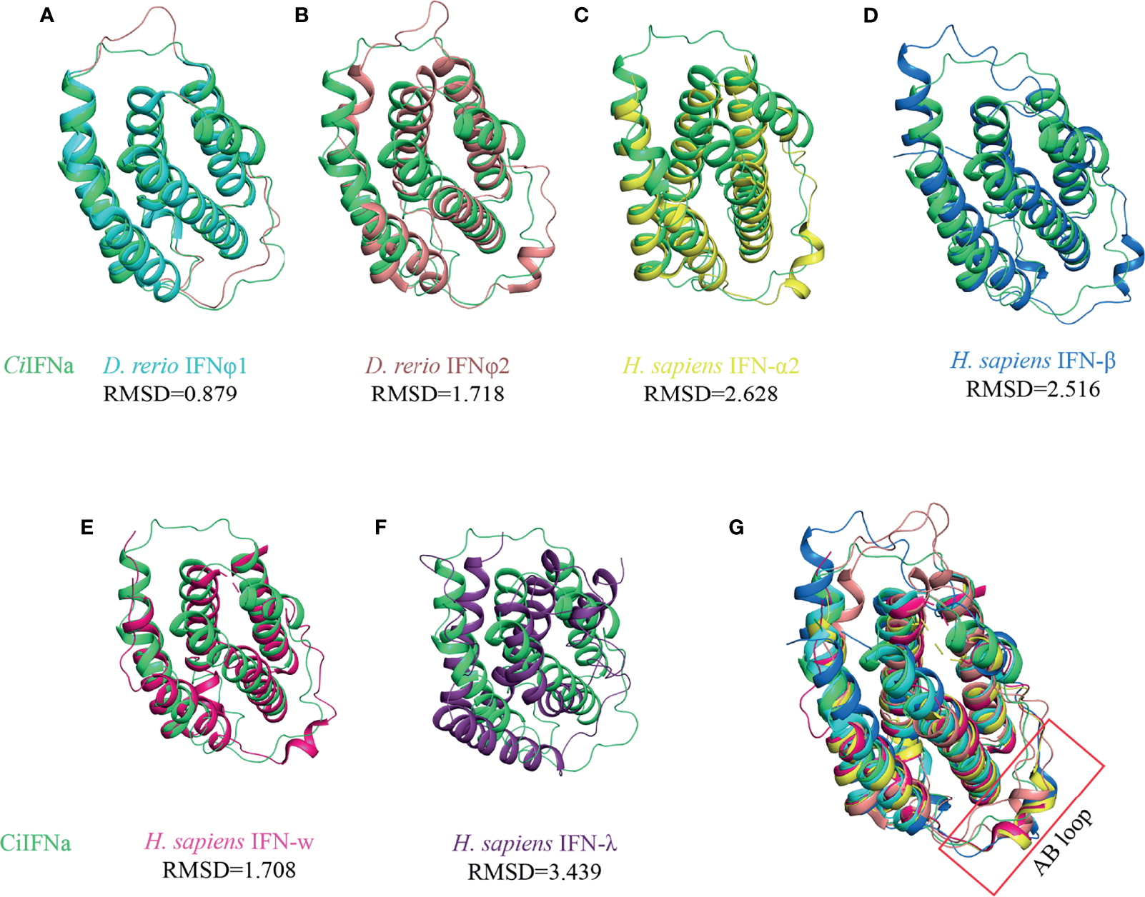 Type I and III IFNs share similar antiviral properties and are believed to have evolved from a common ancestor. Type I ifn genes in cartilaginous fish and bony fish contain 5 exons and 4 introns, the same genomic organization to that of type III ifn genes in sharks and mammals (9). It is interesting that type III ifn genes have not been identified in teleosts. Tetrapod type I ifn genes lack introns. However, despite a high sequence diversity, all type I IFNs share a similar structure consisting of 6 alpha helices (A–F) that are arranged in unique up-up-down-down topology (14). Helices A, C, D, and F form an anti-parallel bundle, and loop AB and loop DE are most variable (15). The helices of type I IFNs are long, straight, and arranged parallel to one another (16). The crystal structures of zebrafish IFNφ1 and IFNφ2 have been solved, which are the only available structures for type I IFNs in fish (17). The overall topology of zebrafish IFNφ1 and IFNφ2 is conserved with that of type I and III IFNs in humans. However, it is more similar to that of human type I IFNs than type III due to the structural difference of helix F (17).