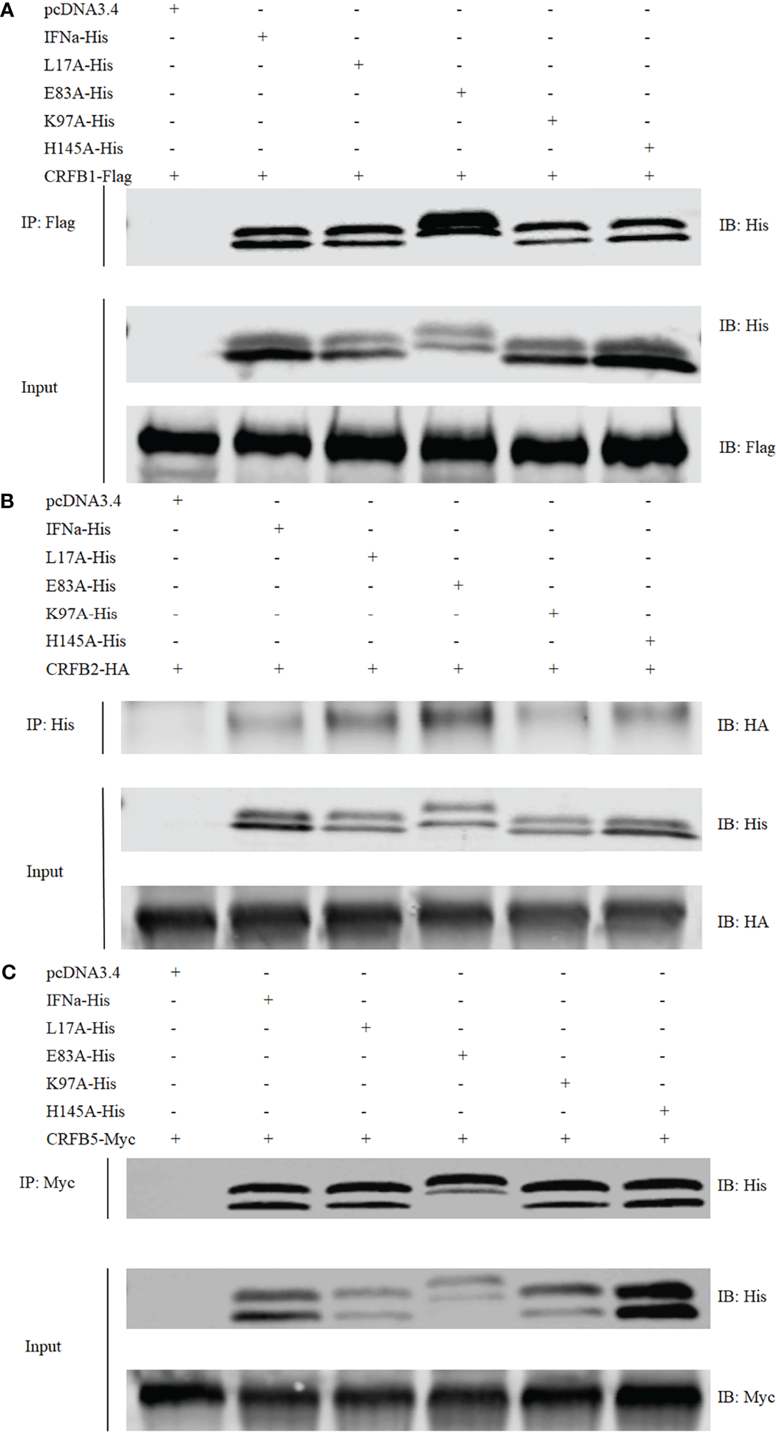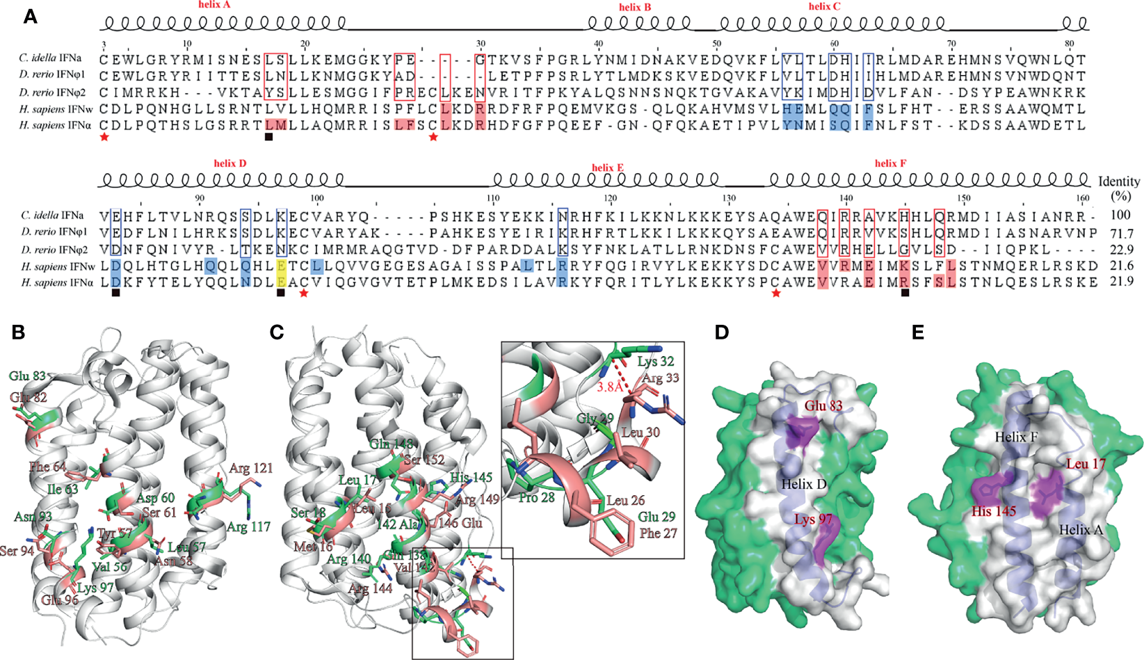 Teleost type I interferons (IFNs) are categorized into group I and II subgroups that bind to distinct receptors to activate antiviral responses. However, the interaction between ifn ligands and receptors has not fully been understood. In this study, the crystal structure of grass carp [Ctenopharyngodon idella (Ci)] IFNa has been solved at 1.58Ã… and consists of six helices. The CiIFNa displays a typical structure of type I IFNs with a straight helix F and lacks a helix element in the AB loop. Superposition modeling identified several key residues involved in the interaction with receptors. It was found that CiIFNa bound to cytokine receptor family B (CRFB) 1, CRFB2, and CRFB5, and the three receptors could form heterodimeric receptor complexes. Furthermore, mutation of Leu27, Glu103, Lys117, and His165 markedly decreased the phosphorylation of signal transducer and activator of transcription (STAT) 1a induced by CiIFNa in the Epithelioma papulosum cyprini (EPC) cells, and Glu103 was shown to be required for the CiIFNa-activated antiviral activity. Interestingly, wild-type and mutant CiIFNa proteins did not alter the phosphorylation levels of STAT1b. Our results demonstrate that fish type I IFNs, although structurally conserved, interact with the receptors in a manner that may differ from mammalian homologs.