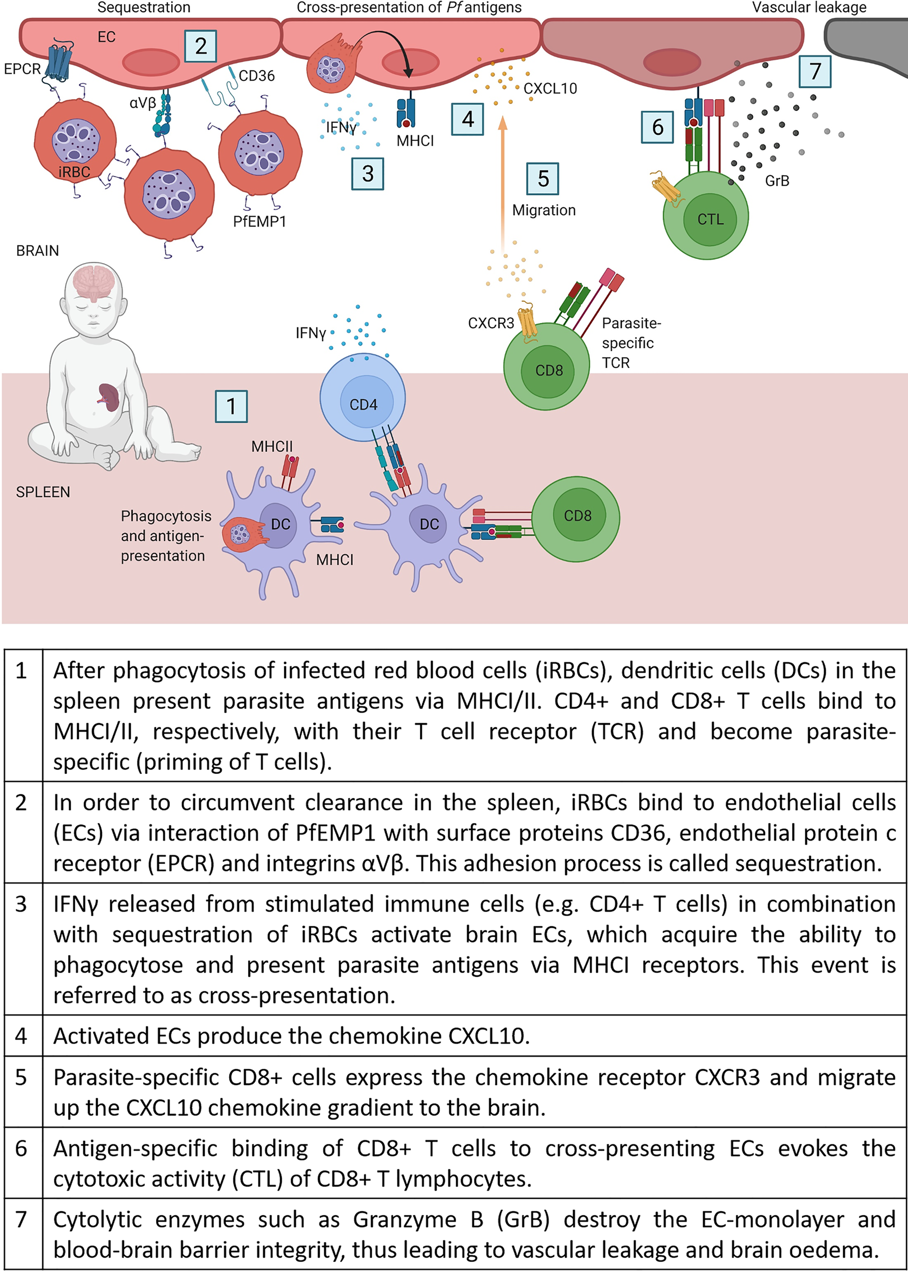 CD8+ T cells recognize pathogens through major histocompatibility complex I molecules (MHCI) on the surface of antigen-presenting cells or infected cells and contribute, therefore, to clearance and immunity against intracellular pathogens. However, as erythrocytes lack MHCI receptors, CD8+ T cells do not recognize Pf infected RBCs and are therefore unable to add to clearance of blood-stage infections. Instead, CD8+ T cells are suspected to be the main drivers for cerebral pathology in humans and experimental mouse models (68, 69). One important step for enabling cytotoxic CD8+ T cells (CTLs) to interfere with brain ECs, is a specific process called cross-presentation. As a result of chronic activation of ECs by sequestration of iRBCs in combination with high IFNγ levels, ECs start to phagocytose parasites (e.g. free merozoites) and present these antigens via their major histocompatibility complex class I (MHCI) (70, 71). In Figure 1, we compile the current knowledge of all the stepwise mechanisms which, as we propose, may lead to CM in non-immune humans.
