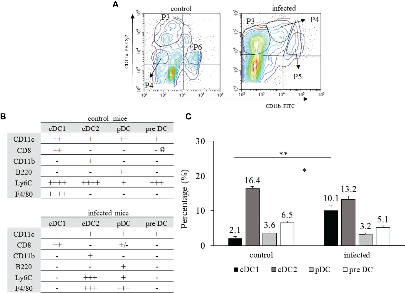 Hepatic dendritic cells’ identification and cellular frequency after T. cruzi infection. C57BL/6 mice were infected with 1x104 blood trypomastigote forms of T. cruzi Y strain and on dpi 15, infected and control mice were euthanized. The HDCs we isolated by enzymatic dissociation and primarily identified according to the expression of CD11c and/or CD11b (A). In control mice, cDC1 and pDC were identified in P3, cDC2 in P6, and pre DC in P4. In infected mice, cDC1 and pre DC were identified in P3, pDC in P4, and cDC2 in P5 (A). The complete phenotype to discern cDC1, cDC2, pDCs, and pre DCs is depicted in B and the frequency of each cellular population is shown in (C) @ Indicates that most pre DCs from control mice do not express CD8 and, therefore, were represented as (-), but about 15% of the cells were CD8+. The primary canonic phenotype for each population is shown in red (B). * means statistical significance (p ≤ 0.05) using the Kruskal Wallis test followed by Dunn’s post-test, and ** means p ≤ 0.01 using the one-way ANOVA test followed by the Tukey’s post-test.