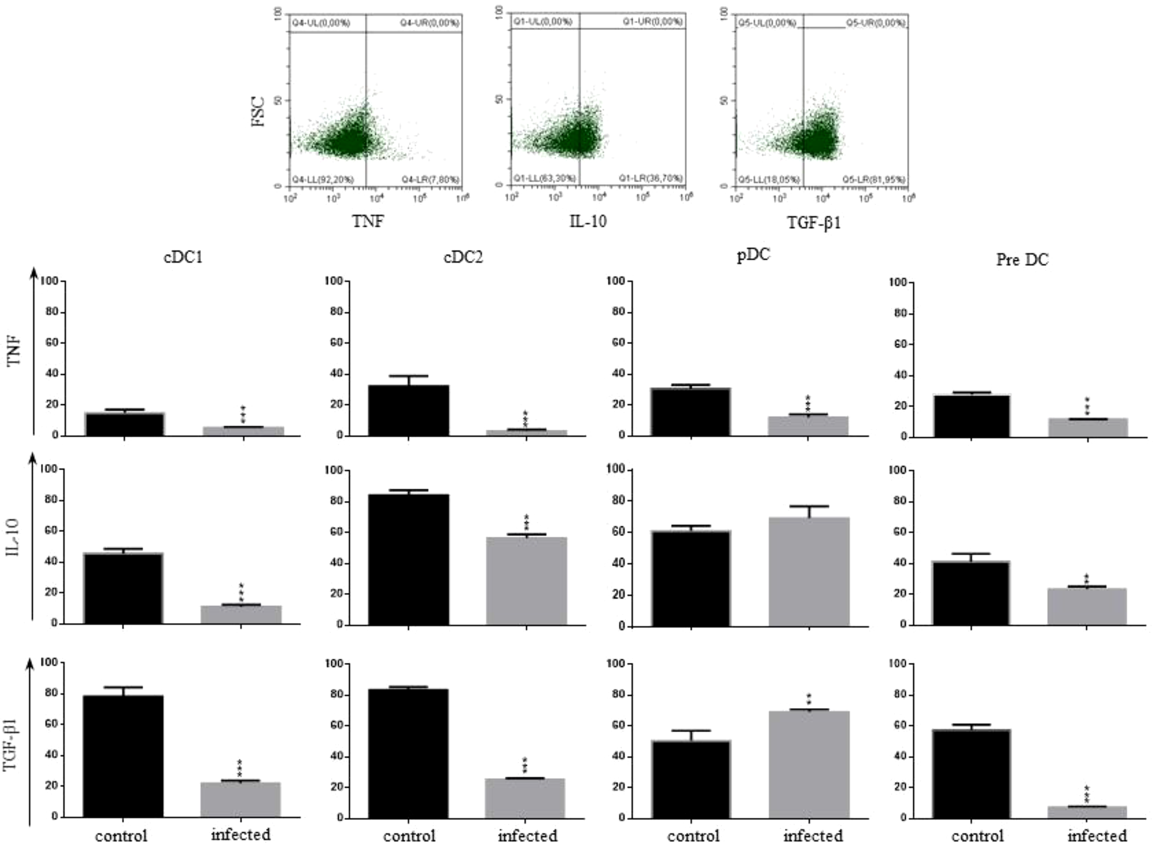 Profile of cytokines produced by hepatic dendritic cells: The definition of TNF-α+, IL-10+, or TGF-β1+ cells was done as illustrated in the dot plots. The frequency of cDC1, cDC2, pDCs, and pre DC producing TNF-α, IL-10, or TGF-β1 was evaluated by flow cytometry in control and T. cruzi infected mice on dpi 15, with the complete gating strategy shown in Supplementary Figures 1 (control) and 2 (infected mice). Statistically significant differences are shown as ** p ≤ 0.05 and ***p ≤ 0.01 using the one-way ANOVA test followed by Tukey’s post-test.
