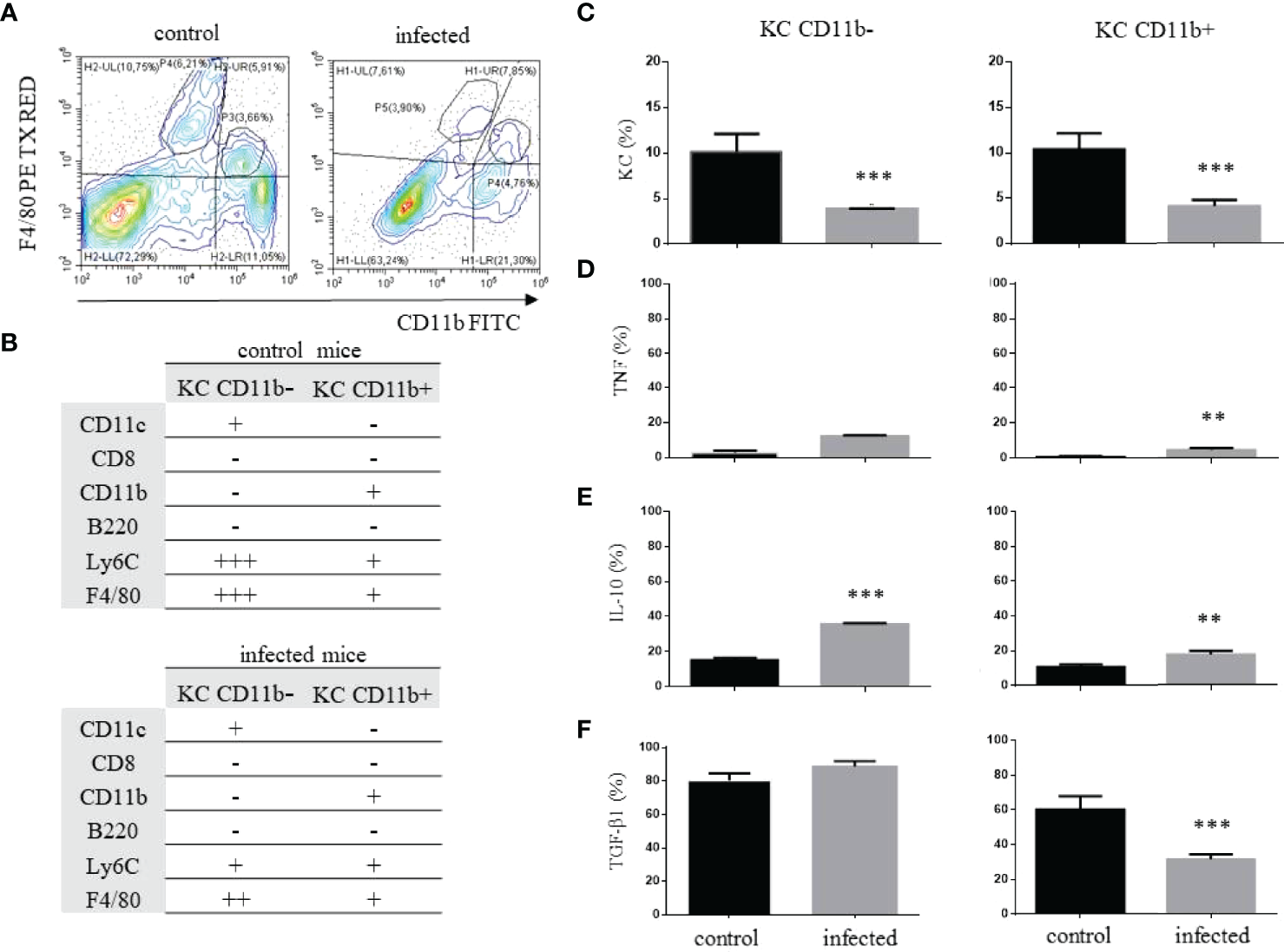 Kupffer cell identification and phenotype after T. cruzi infection. C57BL/6 mice were infected with trypomastigote forms of T. cruzi Y strain and on dpi 15, infected and control mice were euthanized. The KCs were identified as F4/80+ and two subpopulations were depicted according to the expression of CD11b (A). The complete phenotype to discern CD11b- and CD11b+ KCs is shown in (B) and the frequency of each cellular population is shown in (C). The frequency of each subpopulation expressing TNF-α (D), IL-10 (E), or TGF-β1 (F) are indicated for control and infected mice. ** means statistical significance (p ≤ 0.05) and *** means p ≤ 0.01. We used the Kruskal Wallis test followed by Dunn’s post-test to analyze TNF-α and TGF-β1 in CD11b- KC cells. We used the one-way ANOVA test followed by Tukey’s post-test for all other analyses.