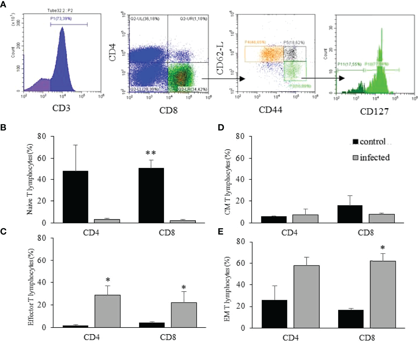 Intrahepatic T lymphocytes after T. cruzi infection. The flow cytometry data analysis was done for CD4+ and CD8+ T lymphocytes (illustrated in A) in the gate of CD3+ events. The gating strategy is shown for EM and effector cells using an infected mouse (A). Then, for each population, the frequency of naïve (CD62L+CD44low); effector (CD62L-CD44highCD127-), EM (CD62L-CD44highCD127+); and CM T lymphocytes (CD62L+CD44high) was analyzed (A). The distribution of naïve (B), effector (C), CM (D), and EM (E) T lymphocytes in the liver of control and infected mice on dpi 15 are shown. * means p ≤ 0.05 and ** means p ≤ 0.005 using the one-way ANOVA test followed by Tukey’s post-test.