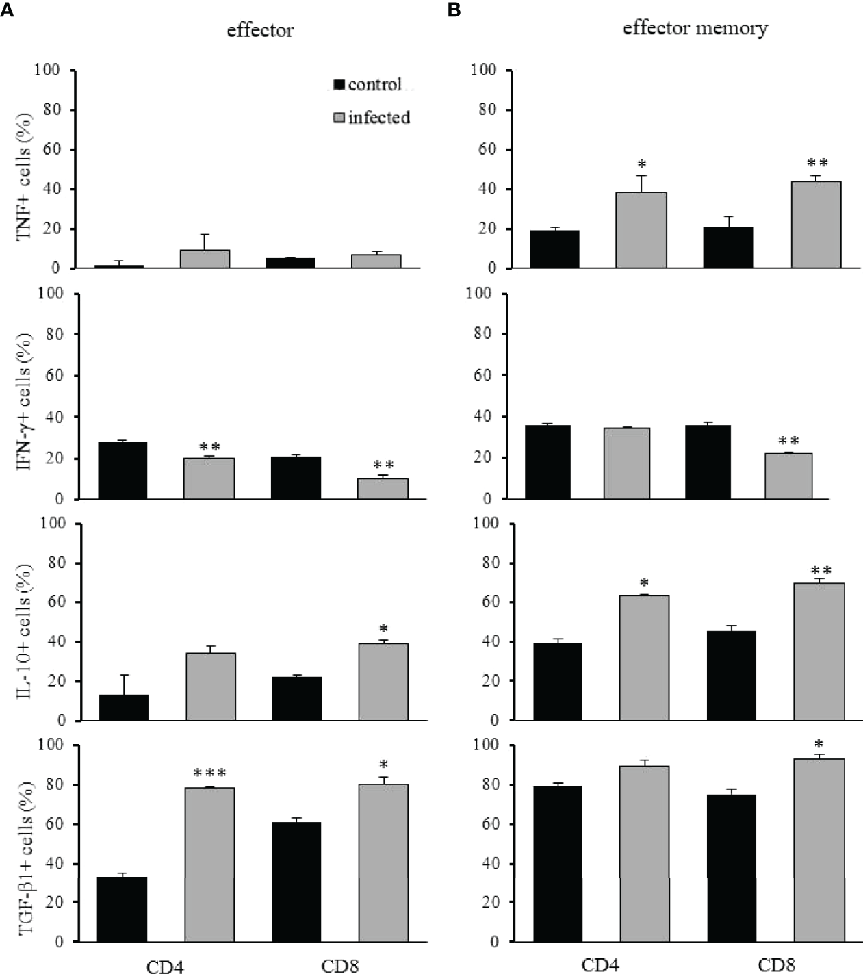 Pro- and anti-inflammatory cytokines produced by effector and effector memory T lymphocytes after T. cruzi infection. The analysis of TNF-α, IFN-γ, IL-10, and TGF-β1 positive CD4+ or CD8+ intrahepatic T lymphocytes are shown as indicated. The cellular frequency of effector and effector memory T cells was evaluated in control and infected mice on dpi 15. * means p ≤ 0.05, ** means p ≤ 0.005, and *** means p ≤ 0.001 using the one-way ANOVA test followed by the Tukey’s post-test.