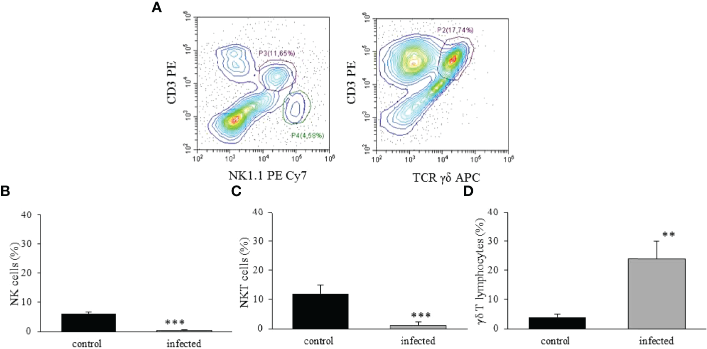 Analysis of NK, NKT, and γδ T lymphocytes in the liver of T. cruzi infected mice. C57BL/6 mice were IP infected with T. cruzi, and the hepatic cells were isolated by enzymatic dissociation on dpi 15. The identification of NK (NK1.1+CD3-), NKT (NK1.1+CD3+), and γδ T lymphocytes (CD3+γδ TCR+) are shown in (A) For better visualization of the populations, a dot plot from a control mouse illustrates the analysis gate of NK and NKT cells, and a dot plot from an infected animal shows the gate of γδ T lymphocytes. The frequency of each cell population is indicated (B–D) in control and infected mice. ** means p ≤ 0.05 and *** means p ≤ 0.01. For NK and γδ T lymphocytes, we used the one-way ANOVA test followed by the Tukey’s post-test, and for NKT cells we used the Kruskal Wallis followed by the Dunn’s post-test.