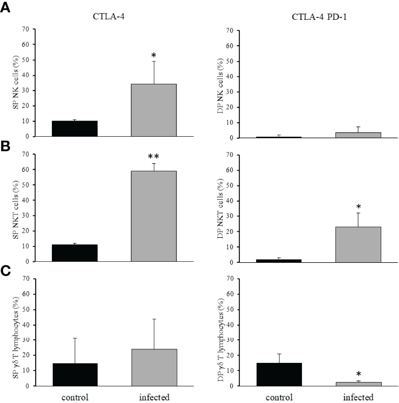 It has already been published that the interaction of PD-1 with its ligand PD-L1 downregulates NK cell function and leads to anergy (35). Similarly CTLA-4 has also been described as a down regulatory molecule for NK cells (36). After T. cruzi infection, we observed an increase in the frequency of hepatic NK cells as CTLA-4 SP, and no alteration in the frequency of NK cells with the CTLA-4+PD-1+ DP phenotype (Figure 8A). Both molecules have also been described as downregulatory components for NKT cells (37, 38), and we observed a significant increase in CTLA-4+PD-1+ DP and CTLA-4+ SP NKT cells after infection (Figure 8B). Finally, γδ T lymphocytes are also under the surveillance of both immunoregulatory molecules (39, 40), and although γδ T lymphocytes rarely express CTLA-4, they can upregulate PD-1 upon activation. After infection, we observed no alteration in the frequency of cells as CTLA-4+ SP, and there was a reduction in CTLA-4+PD-1+ DP γδ T lymphocytes (Figure 8C).