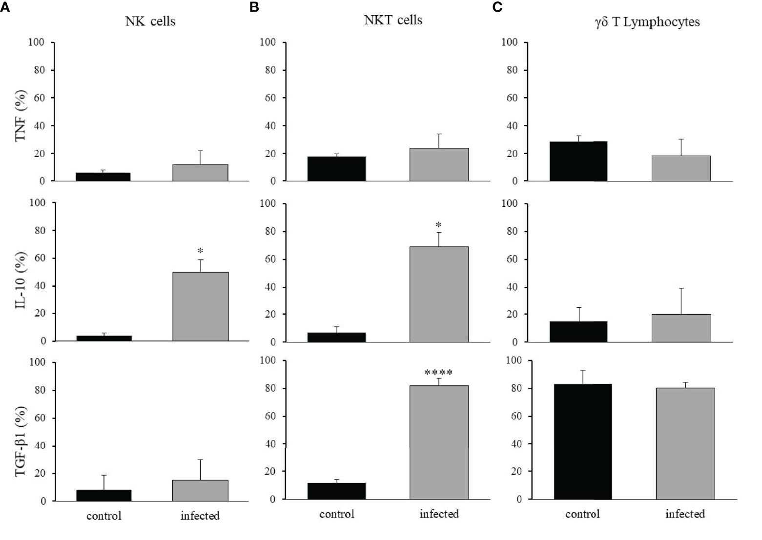 Production of anti- and pro-inflammatory cytokines by NK, NKT, and γδ T lymphocytes. The intrahepatic cells were isolated from control and T. cruzi infected mice on dpi 15, and the production of TNF-α, IL-10, or TGF-β1 was analyzed in NK (A), NKT (B), and γδ T lymphocytes (C). * means p ≤ 0.05, **** means p ≤ 0.001 using the Kruskal Wallis test followed by the Dunn’s post-test.