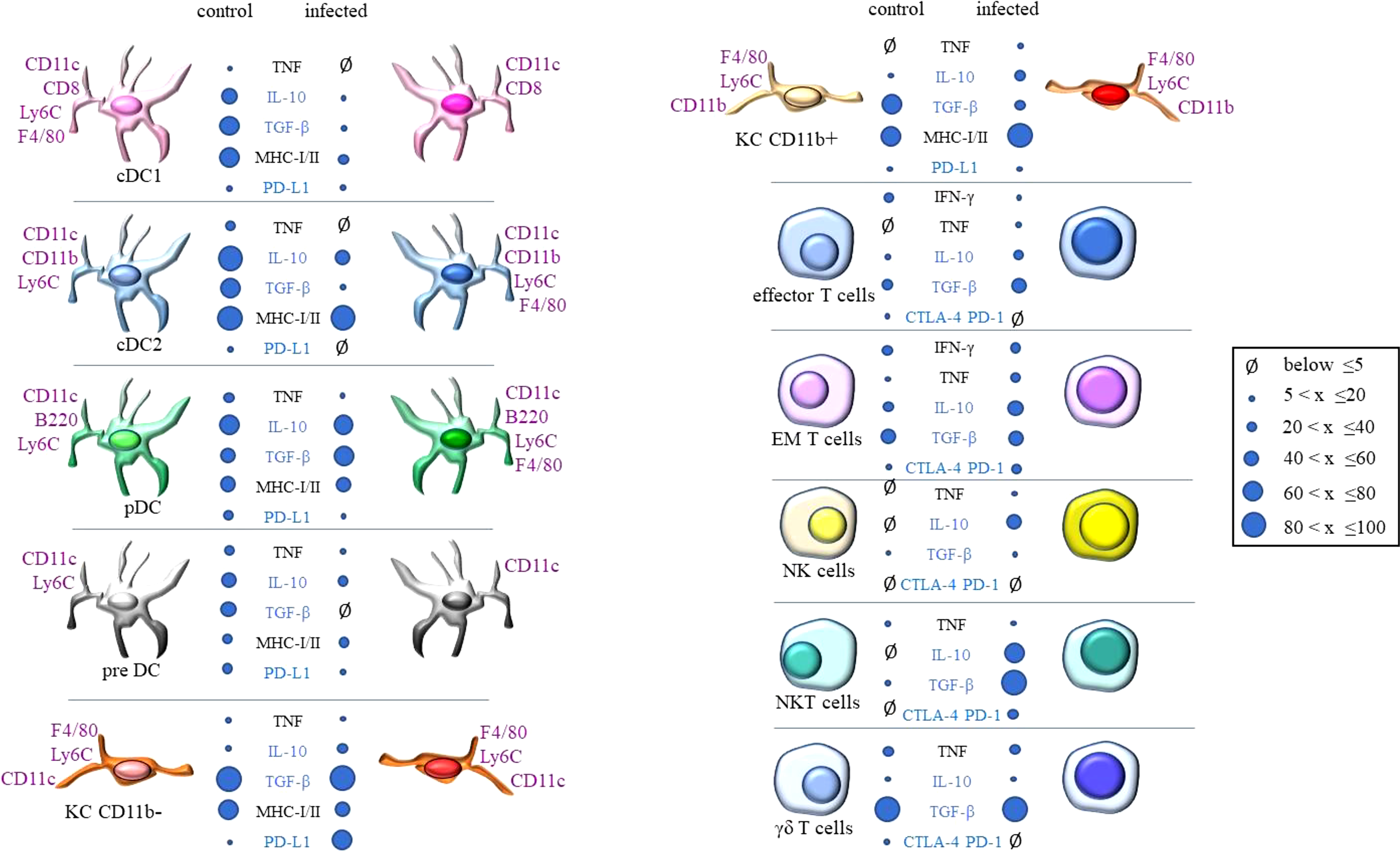 Summary of phenotypic modulations observed in hepatic cells from control and T. cruzi infected mice obtained on dpi 15 (acute phase). The results obtained by flow cytometry were stratified in this chart according to the frequency of cells expressing each marker. Subpopulations with up to 5% of frequency were considered not represented. The dimension of each dot proportionally represents the frequency of each subpopulation found in flow cytometry analysis. According to the legend, the intervals vary from 5% to 20% of positive cells, 20% (exclusive) to 40%, and so on. Effector and EM lymphocytes represent the results for CD4 or CD8 cells.