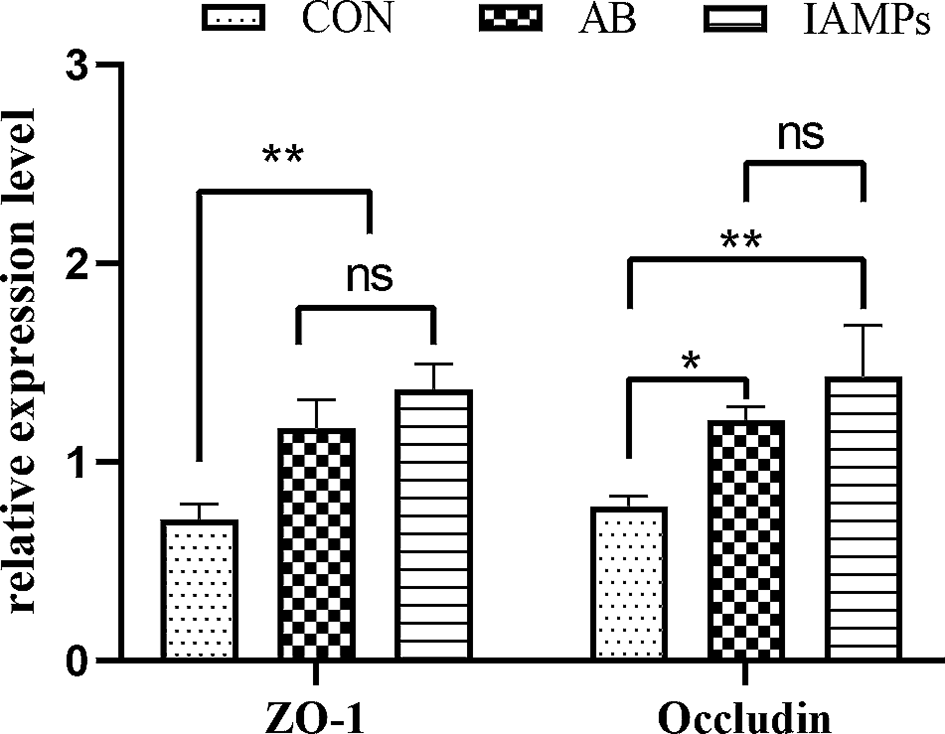 As shown in Table 4, the IAMPs group had higher concentrations of serum IgE and IgG than the CON group (p < 0.05), without showing significant difference compared to the AB group. The concentration of serum IgM in IAMPs group was higher than that in the CON and AB groups (p < 0.05). The concentrations of serum IgA in the IAMPs group was not significantly changed compared to the other two treatments. Meanwhile, IAMPs diet significantly increased the concentration of serum GSH-Px compared to the CON group (p < 0.05) but not the AB group. The SOD concentration in the serum of IAMPs group was higher (p < 0.05) than that in the CON and AB groups, while the concentrations of MDA and T-AOC in serum were not significantly changed by dietary treatments.