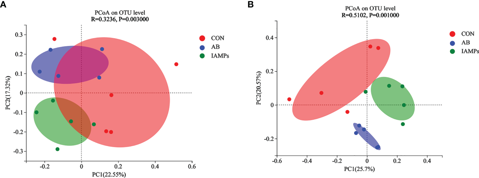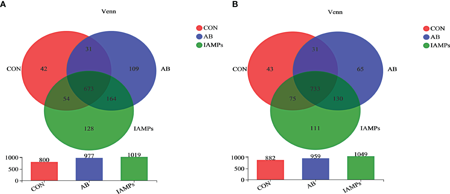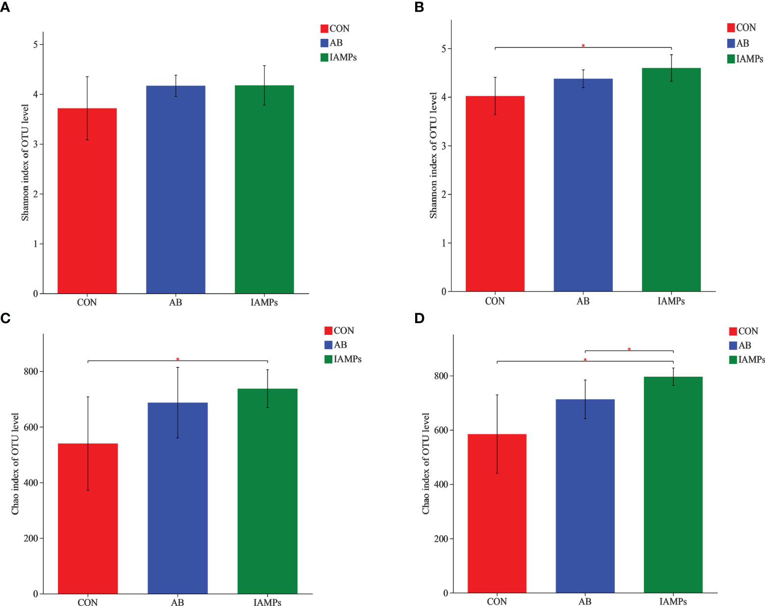 A total of 21 weaning piglets [Duroc ×(Landrace ×Yorkshire)] with initial body weight (7.64 ± 0.65 kg) were randomly allocated to one of three treatments with seven replicates (one pig per replicate) per treatment according to sex and weight in randomized complete block design. Pigs in the three treatments were fed corn–soybean meal-based diet (CON), corn–soybean meal-based diet + flavomycin (25 mg/kg) + quinone (50 mg/kg) (AB), and corn–soybean meal-based diet + 1,000 mg/kg IAMPs, respectively. The animal experiment lasted for 28 days, including early stage (0–14 days) and late stage (15–28 days). All the piglets had free access to the feed and water, while the living house of pigs was treated with pest control and immunization according to the routine procedures and was cleaned and disinfected regularly. The room temperature is automatically adjusted by a thermostatic controller, and the window is opened for ventilation at regular time. All the experimental diets meet the nutritional requirements of weaning piglets recommended by NRC (2012) (Table 1).