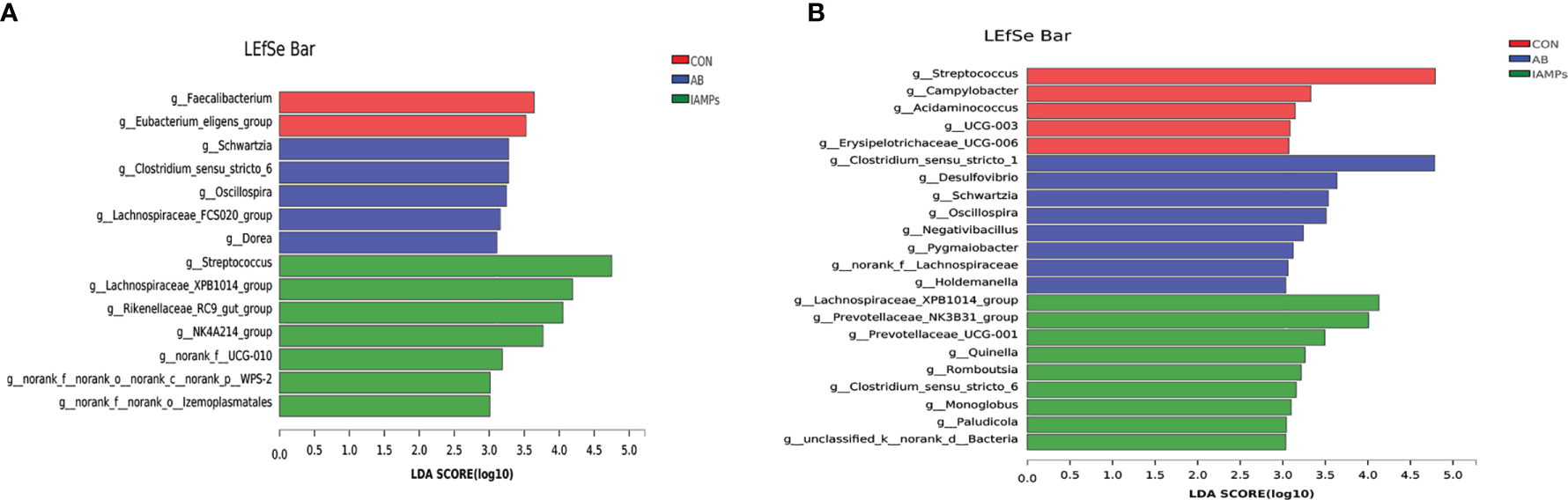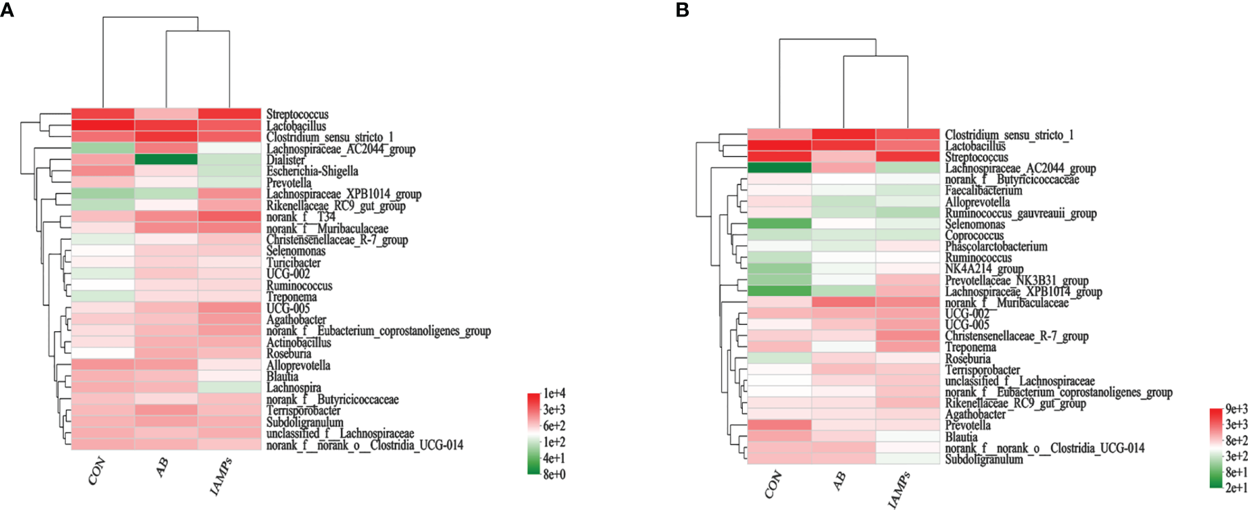 SEM, standard error of the means (n = 7); ADG, average daily gain; ADFI, average daily feed intake; G:F, gain:feed; CON, corn–soybean based diet; AB, CON + 25 mg/kg flavomycin + 50 mg/kg quinocetone; IAMPs, CON + 1,000 mg/kg IAMPs.