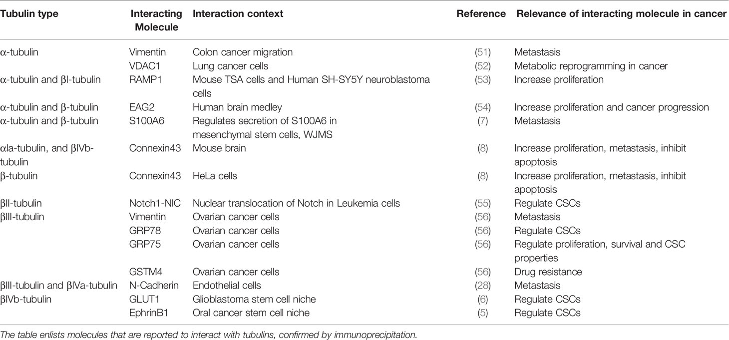 Microtubules, a major class of the cytoskeleton of cells, are formed of heterodimers of α and β tubulins (1). In addition to the heterogeneity of the tubulin isotypes forming the dimers, their post-translational modifications and interacting proteins influence the dynamics of microtubules (2, 3). As microtubules regulate plethora of cellular processes, their deregulation is associated with diseases, including cancer. As the field evolves, it appears that the tubulin isotypes might have unique functions specified by their interacting molecules, which again is defined by their unique C-terminal end sequence and the post translational modifications (PTMs) therein (2). Deregulation of some of the tubulin isotypes in cancer suggests their involvement in cancer progression. Though microtubule targeting agents (MTA) have been used in cancer treatment for a long time, the role of the tubulin isotypes in the cancer stem cell (CSC) context was not explored extensively. Some of the recent findings suggest that specific tubulin isotypes have some important roles in regulating certain functionally essential molecules involved in the induction and maintenance of CSCs (4–8). This review focuses on the molecules that are shown to interact with tubulin isotypes, probably their cargos. We discuss the recent reports portraying the role of tubulin isotypes and their plausible cargos in metabolic reprogramming, induction of CSCs and modulation of immune evasion