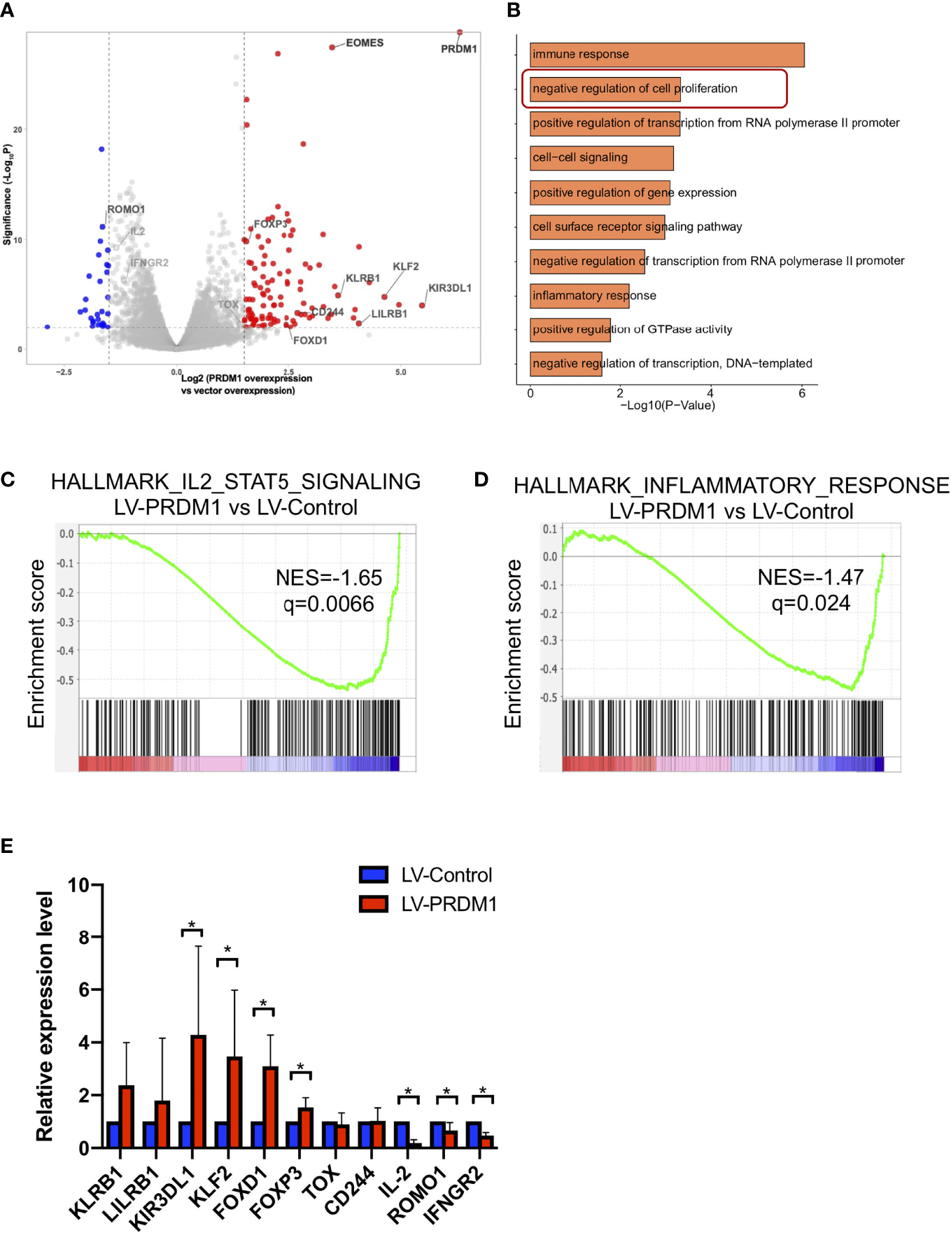 T cell highly expressing PRDM1 exhibited tolerant transcription profiling. (A) RNA-seq volcano plots comparing gene expression between PRDM1-overexpressing T cells and control T cells (n = 3). FDR q-value < 0.01, |log2fold change| > 1.5. (B) Gene pathway enrichment analysis for the upregulated genes in PRDM1-overexpressing T cells. (C, D) GSEA pathway enrichment plot in PRDM1-overexpressing T cells versus control T cells. NESs and P values are shown for each gene set. P values were calculated by Kolmogorov-Smirnov test. (E) Quantitative real-time PCR was used to validate upregulated and downregulated genes in PRDM1-overexpressing T cells detected by RNA-seq (n = 5). Wilcoxon rank sum test was performed to assess the significance of relative gene expression. *P < 0.05.