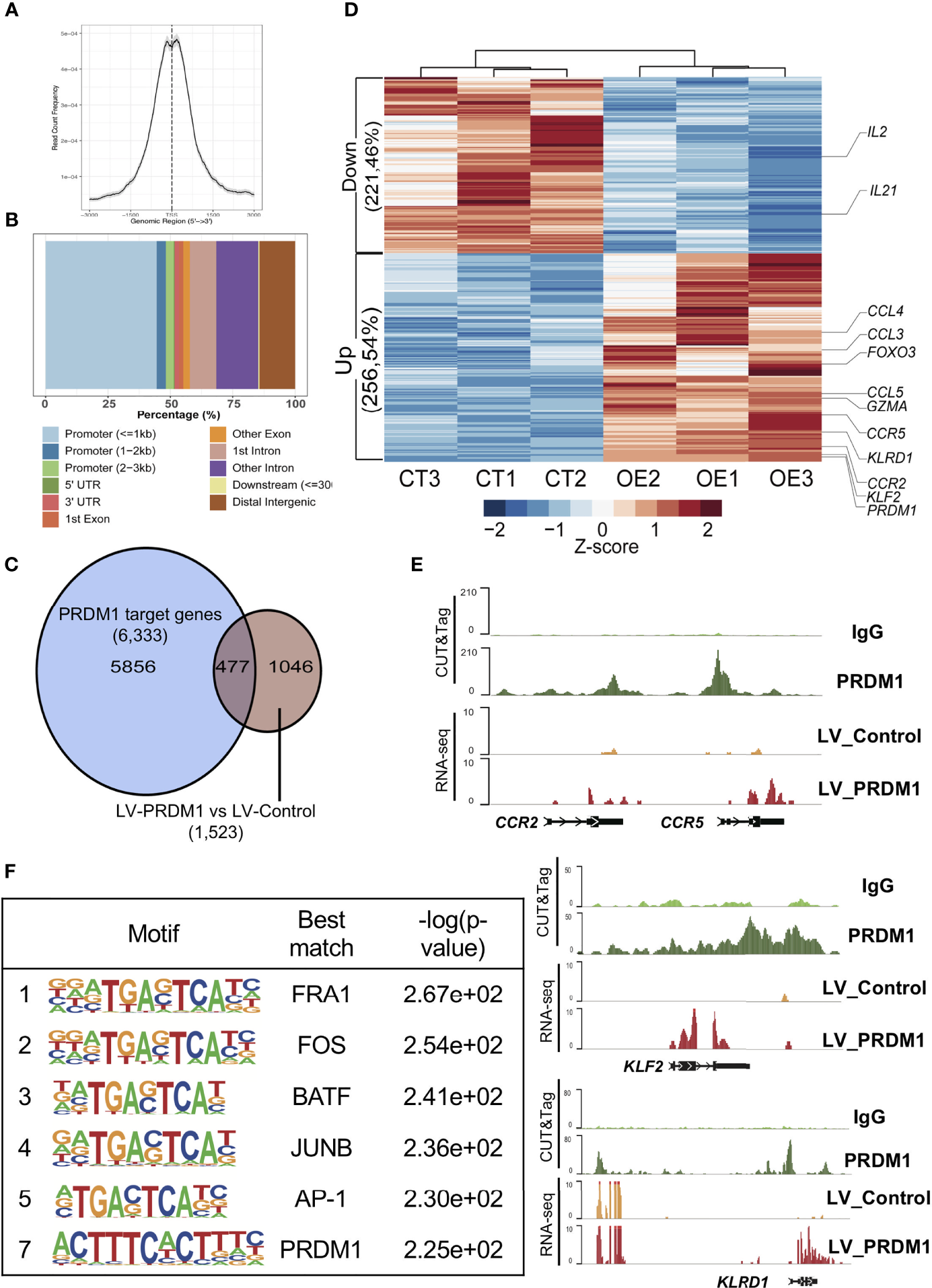 PRDM1 directly upregulated T cell inhibitory gene expression in primary T cells. (A) Aggregate plot of PRDM1 binding site around transcription start sites. (B) Locations of PRDM1 binding sites. (C) The overlap between PRDM1 target genes and differential expression genes in PRDM1-overexpressing T cells compared with control T cells. (D) Heatmap showed PRDM1 directly regulated differential expression genes in PRDM1-overexpressing T cells (OE group) compared with control T cells (CT group). FDR q-value < 0.05, |log2fold change| > 1. (E) WashU browser views showed PRDM1 biding sites (CUT&Tag) and related gene expression level (RNA-seq). (F) Top 7 enriched transcription factor motifs in the PRDM1 CUT&Tag peaks are shown.