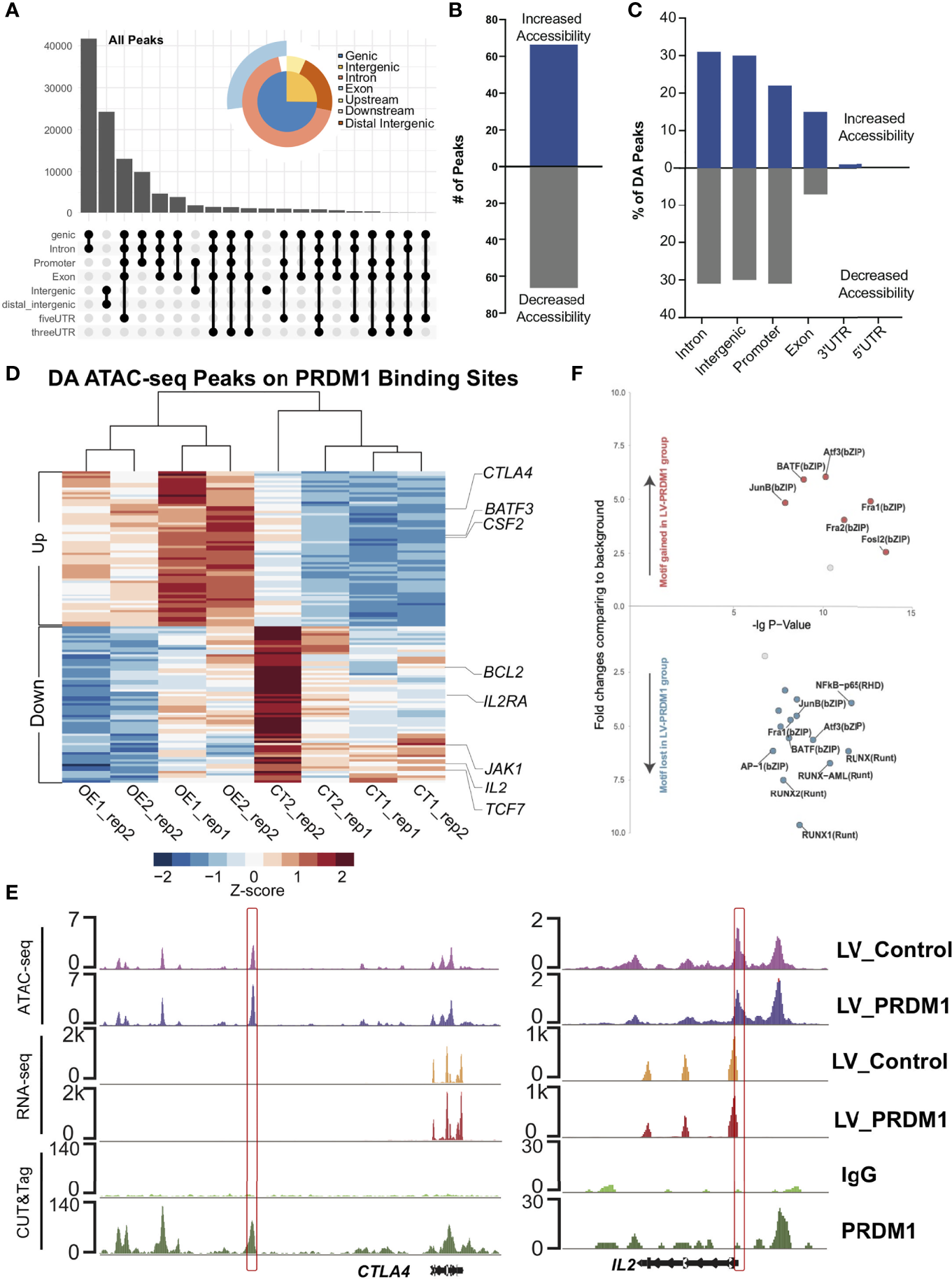 PRDM1 reshaped the epigenetic profile of T cell tolerance regulation-related target regions. (A) Categories of cis-element in all open chromatin regions (OCRs). (B) Overall OCR peak changes for PRDM1-overexpressing T cells compared to control T cells. (C) Categories of cis-element OCR peaks that changed between PRDM1-overexpressing T cells and control T cells. (D) Heatmap shown differentially accessible (DA) peaks overlapped with the PRDM1 CUT&Tag binding peaks between PRDM1-overexpressing T cells and control T cells. Selected genes assigned to the peaks are indicated. FDR q-value < 0.05. (E) WashU browser views showed PRDM1 biding sites (CUT&Tag), related gene expression level (RNA-seq) and chromatin accessibility (ATAC-seq). (F) Transcription factor motif gain or loss associated with overexpression of PRDM1. X axis represents the -logP value of the motif enrichment. Y axis represents the fold change of the motif enrichment. Targeted motifs in the changed OCR between the LV-PRDM1 and LV-Control groups were compared to the whole genome background to calculate p value and fold change.