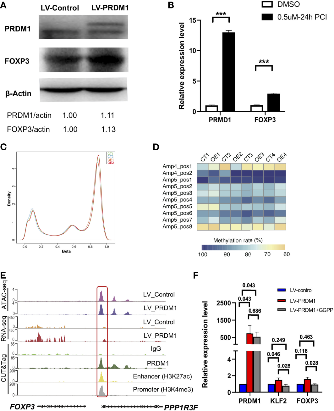 PRDM1 induced FOXP3 expression by directly binding to upstream enhancer and indirectly by upregulating KLF2. (A) Western blot showed the protein level of PRDM1 and FOXP3 in PRDM1 overexpressing Jurkat T cells compared with control T cells (two experiment repeats). (B) Quantitative real-time PCR showed the expression level of PRDM1 and FOXP3 in Jurkat cells treated with DMSO or PCI-24781. (C) Density of beta values distribution in PRDM1-overexpressing T cells and control T cells. (D) Heatmap showed the degree of methylation at each CpG motif according to the color code. (E) WashU browser views showed PRDM1 biding sites and histone modifications around FOXP3 gene locus. (F) Quantitative real-time PCR showed the expression level of PRDM1, KLF2 and FOXP3 in control T cells, PRDM1-overexpressing T cells and KLF2 inhibitor GGPP treated PRDM1-overexpressing T cells, respectively (n = 6). Friedman Test showed the P value is 0.03 for PRDM1, KLF2 and FOXP3. Then P value was analyzed by Wilcoxon rank sum test. ***P < 0.05.