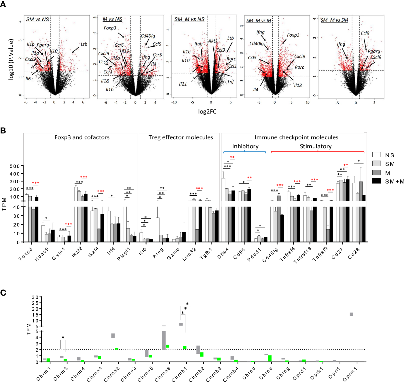 Morphine (M) is stronger than cigarette smoke (SM) in re-shaping Treg cell transcriptomes and SM + M have synergy in modulating Treg cell transcriptomes. (A) Volcano plots illustrate log 10 (p-value) in relation to the log 2 (fold change) for the treatments versus control (n = 2). The differentially expressed genes with -log10 (p. value) >1.3 and |log2FC| >1 are displayed in red. Cytokines, chemokines and receptors with transcriptomic changes are labeled. (B) Bar graph show the level of transcripts of Foxp3 and cofactors, Treg effector molecules, and immune checkpoint molecules in Treg from four groups. (C) Bar graph show the level of transcripts of 15 nicotinic receptors and 4 opioid receptors in Treg from four groups. TPM, Transcripts per Million mapped reads (T test, *p < 0.05, **p < 0.01, ***p < 0.001, * in black represents the difference between SM, M or SM+M and NS control, * in red represents the difference between SM+M and SM or M).