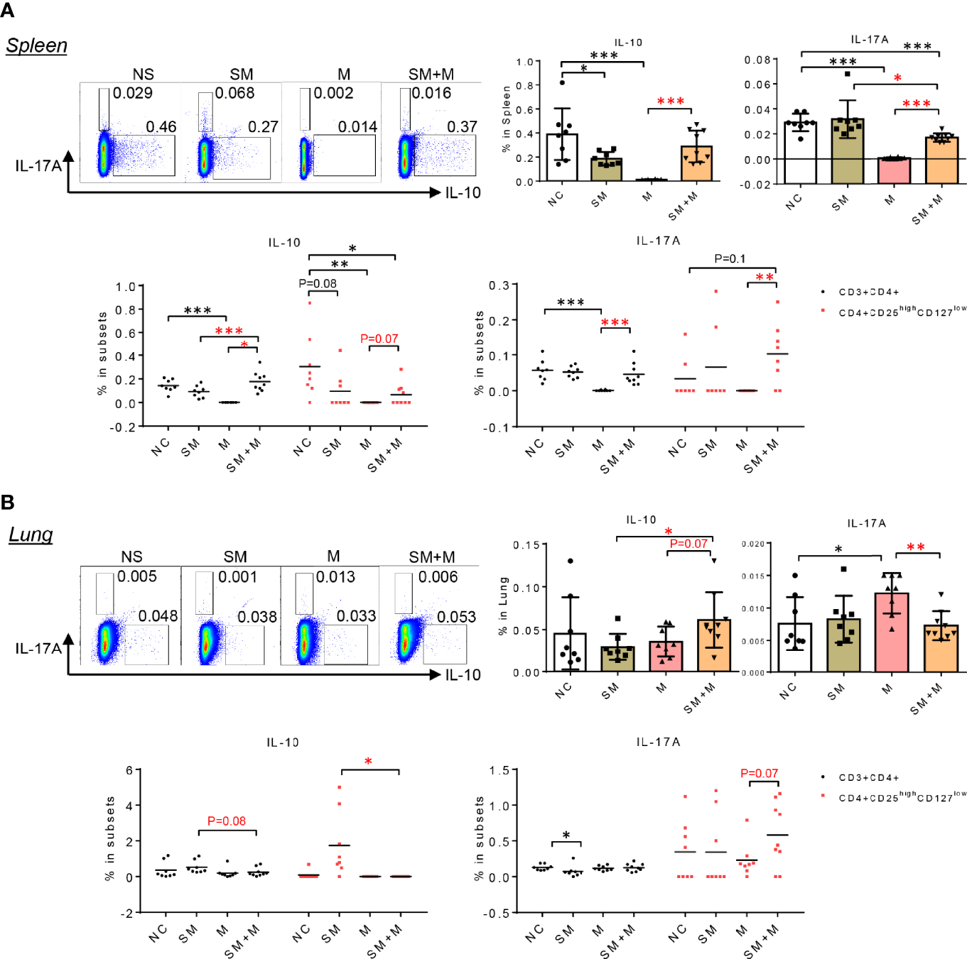SM + M stimulated IL-17A production in CD4+CD25highCD127low Treg cells from spleen and lung. (A) Representative flow cytometry gating and quantitative bar graph show the IL-17A and IL-10 production in splenocytes upon treatments. Dot plot indicate the frequency of IL-10 and IL-17A producing cells in CD3+CD4+ T cells and Treg cells. (B) Representative flow cytometry gating and quantitative bar graph show the IL-17A and IL-10 production in lung cells upon treatments. Dot plot indicate the frequency of IL-10 and IL-17A producing cells in CD3+CD4+ T cells and Treg cells. (n = 8) (T-test, *p < 0.05, **p < 0.01,***p < 0.001, * in black represents the difference between SM, M or SM+M and NS control, * in red represents the difference between SM+M and SM or M).