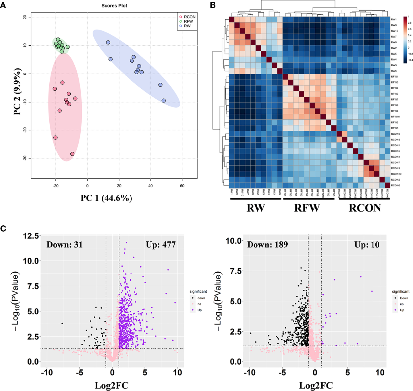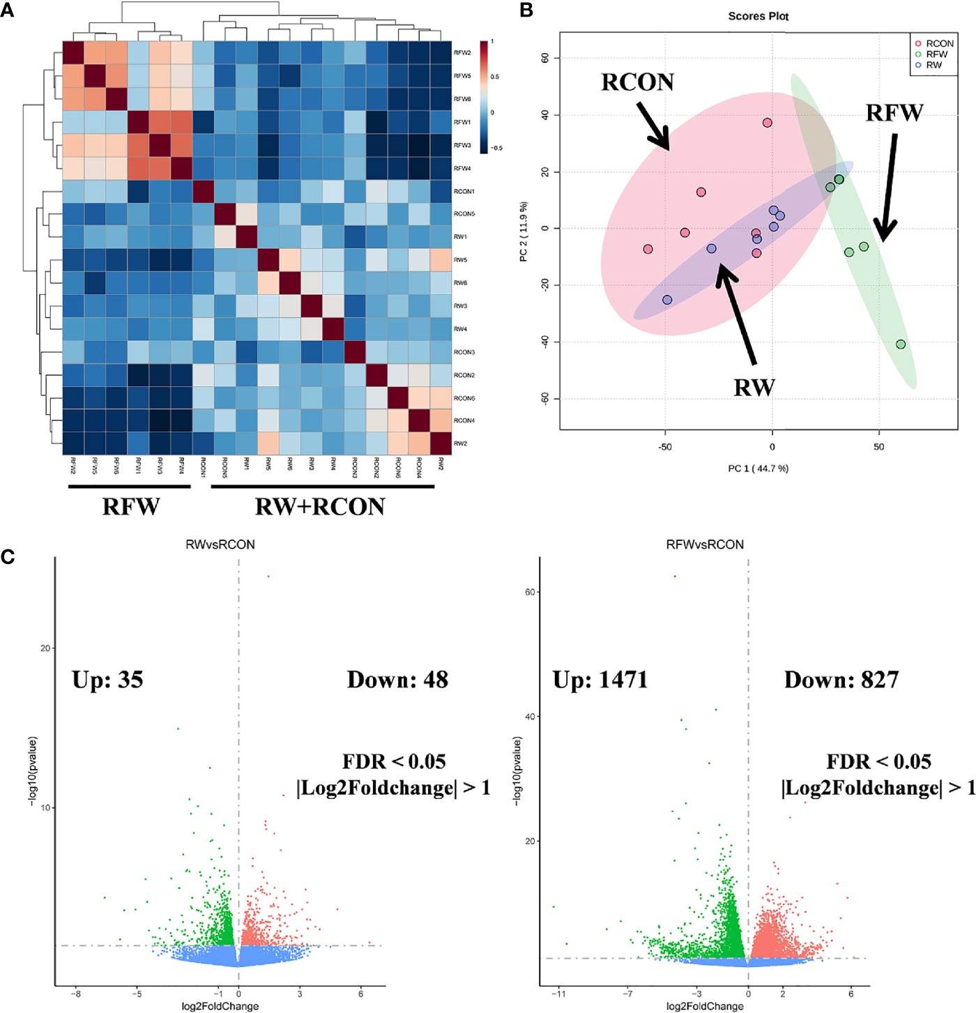 Landscape of the transcriptomic patterns of sheep after RFW and RW treatments. (A) Correlation analysis on all samples showing two distinct clades: samples of RFW and RW+RCON. The correlation value between samples were represented by the color of each cell. (B) Principal component analysis (PCA) on the metabolic profiles of sheep after RFW and RW treatments. Three regions within 95% confidence intervals were formed in the PCA plots, including RCON, RW and RFW. (C) Volcano plots showed the differentially expression genes in RW vs. RCON (left) and RFW vs. RCON (right) pairwise comparisons. The upregulated and downregulated genes were shown in pink and green, respectively, whereas blue dots represented the genes without significance in each comparison.
