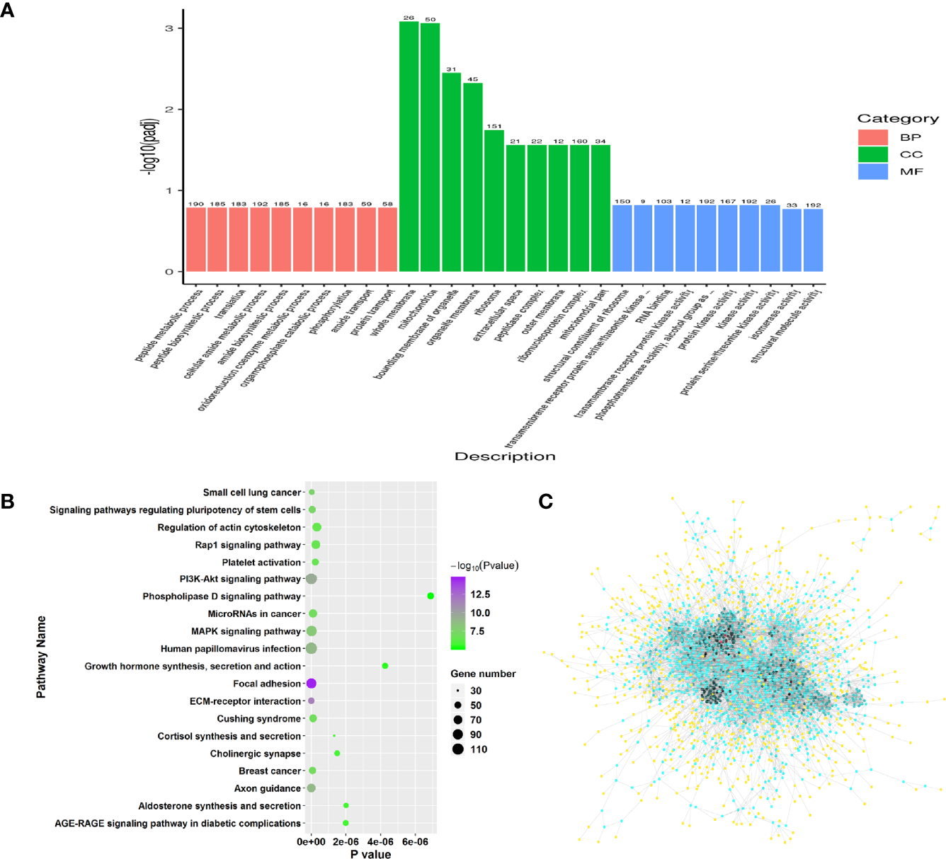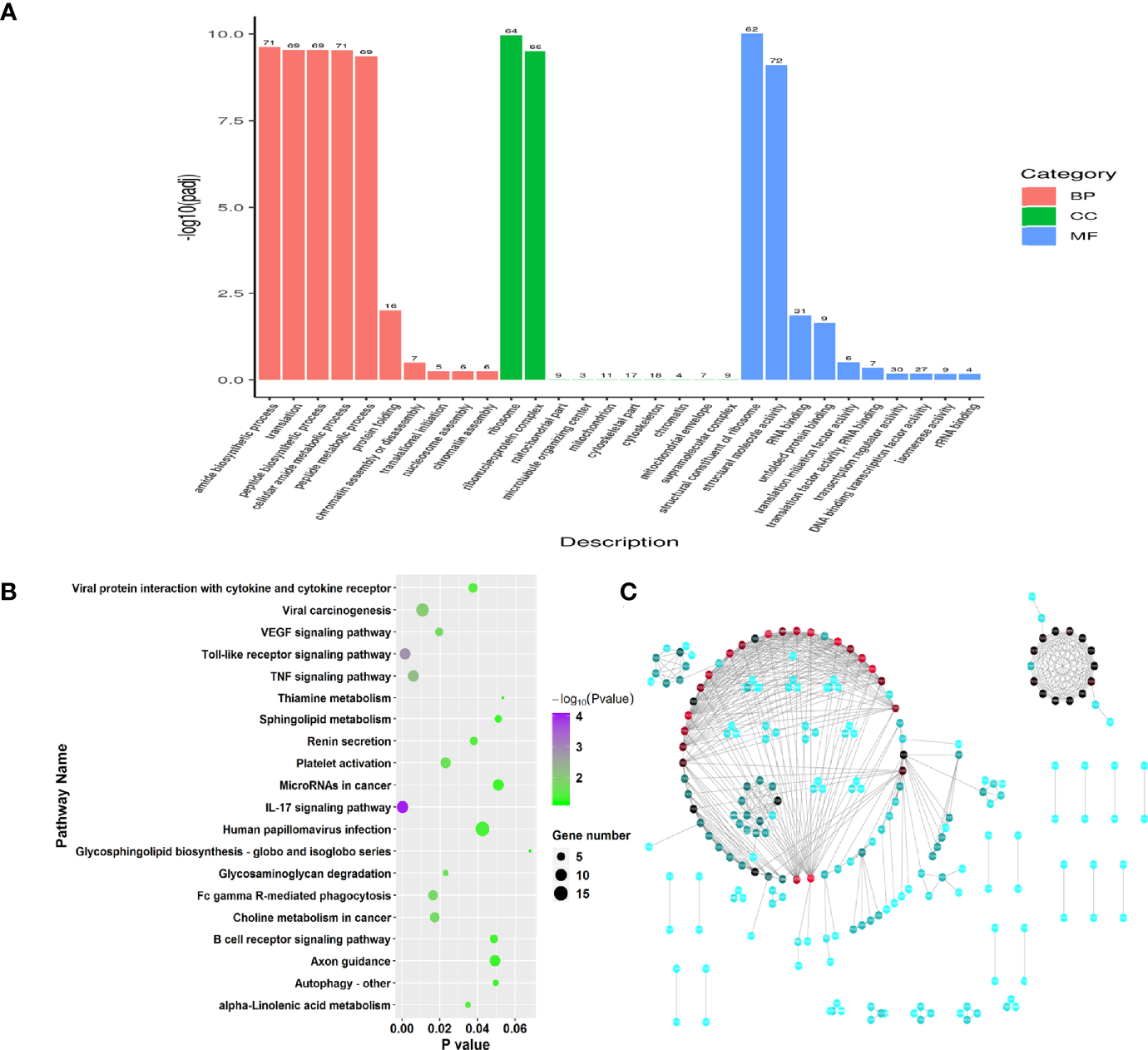 Function enrichment analysis on the significant differential genes in RW vs. RCON comparison. (A) Gene ontology enrichment analysis on all differential genes in RW vs. RCON comparison. Three main kinds of terms relevant to biological process, cellular component and molecular function were shown in pink, green and blue, respectively. The vertical coordinate represented the P value of each GO term. (B) Dot plots showing the results of KEGG pathway enrichment analysis on upregulated genes upon RW treatment. The dot size represented the gene number involved in each pathway, whereas the dot color represented the P value of each pathway. The abscissa represented the P value. (C) Protein-protein interaction network of RW-associated genes. The dot color represented the importance of each gene in this topological network.