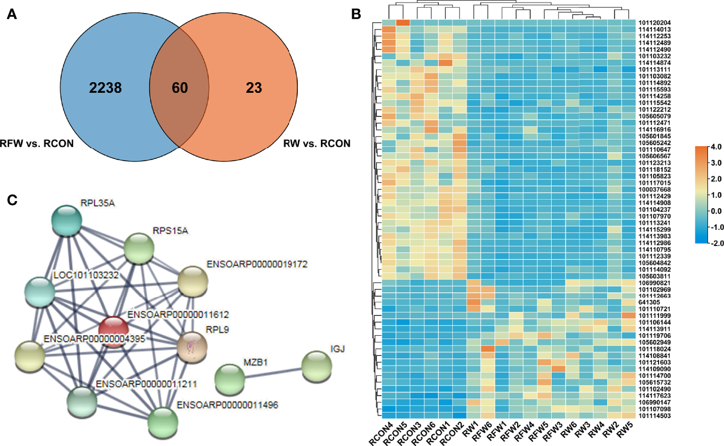 Immune-related genes were shared in RFW vs. RCON and RW vs. RCON comparisons. (A) Venn diagram showed that genes shared in RFW vs. RCON and RW vs. RCON pairwise comparisons. The DEGs from RFW vs. RCON and RW vs. RCON were represented by blue and orange circles, respectively. (B) Heatmap displayed the expression pattern of 60 DEGs shared in RFW vs. RCON and RW vs. RCON pairwise comparisons. The up- and down-regulated genes were shown in red and blue, respectively. The gene expression levels were represented by the normalized FPKM values of gene in each sample. (C) The protein-protein interaction network of the genes shared in both comparisons.