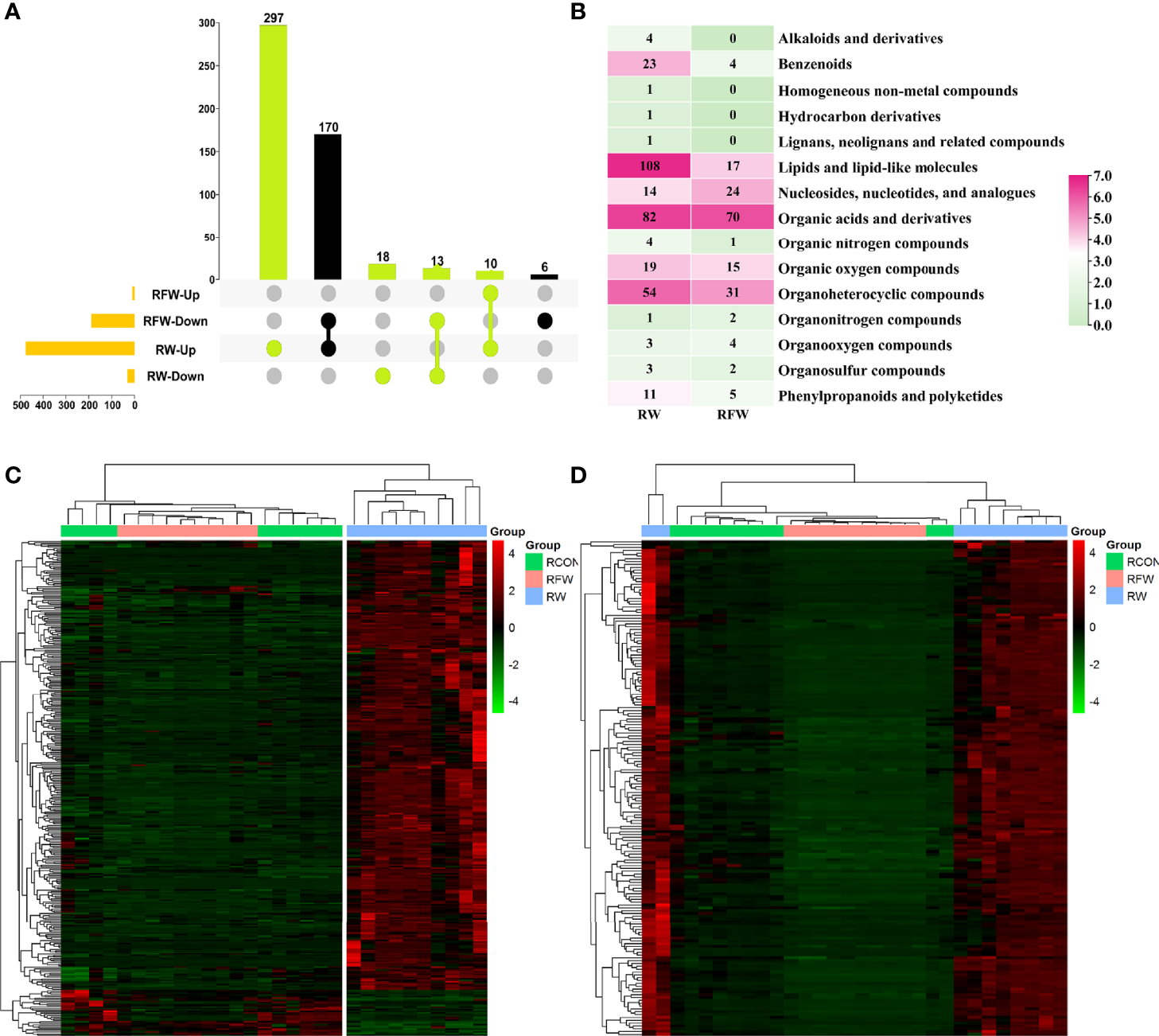 Identification of candidate RFW- and RW-associated metabolites. (A) Upset diagram showed the specific metabolites identified in RFW vs. RCON and RW vs. RCON pairwise comparisons. RFW- and RW-associated metabolites were shown in black and light green, respectively. (B) Classifications of metabolites closely correlated with RFW and RW treatments. The color represented the metabolite number in each classification, and the number were shown in each cell. (C, D) Heatmap displayed the relative level of RW (C) and RFW -associated (D) metabolites. The metabolites with high levels were shown in red, whereas the metabolites with low levels were shown in green. The normalized peak area of each metabolite was used to represent the levels.