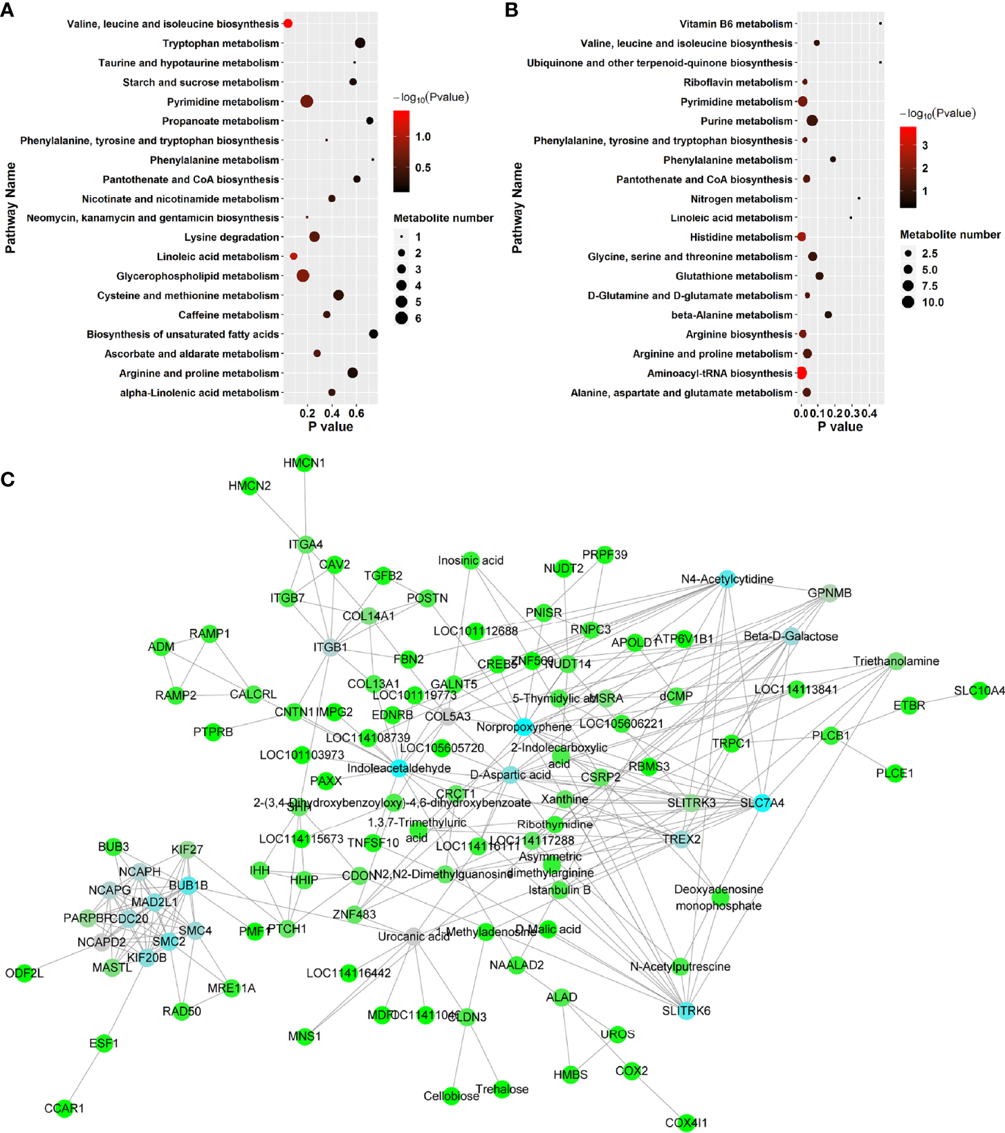 Subsequently, pathway enrichment analysis was performed on the upregulated and downregulated genes in RW vs. RCON comparison based KEGG database. 35 upregulated genes were enriched in 257 pathways, with 16 significant pathways (Figure 2B, P < 0.05). We noted various immune-related pathways were significantly activated upon RW treatment, such as IL-17 signaling pathway, Toll-like receptor signaling pathway, TNF signaling pathway, autophagy and phagocytosis, as well as the expression of cytokines (Figure 2B). In addition, RW also altered the gene expression relevant to metabolisms, such as glycosaminoglycan degradation and alpha-linolenic acid metabolism (Figure 2B). Further pathway analysis on 48 downregulated genes showed that RW-suppressed genes mainly functioned in pathways relevant to metabolisms. Various pathways relevant to amino acid and fatty acid metabolisms, such as valine, leucine and isoleucine degradation, butanoate metabolism, sulfur metabolism, fatty acid degradation, propanoate metabolism, tryptophan metabolism and fatty acid elongation, thiamine metabolism, were significantly enriched (Supplementary Figure 1A). Meanwhile, these genes involved in a duplicated interaction network in vivo, suggesting that RW altered transcriptional patterns in sheep on a global scale, leading to activation and metabolic redirection of immune-related genes associated with fatty acids and amino acids in sheep (Figure 2C).