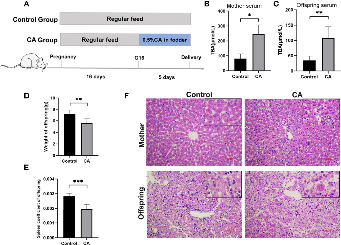 Furthermore, we developed a rat model of cholestatic pregnancy to investigate the subsequent outcomes in the offspring. Twelve SD female rats were randomly allocated to two groups with 0 or 0.5% (w/w) CA supplement diet at gestation day 16 and continued until labor. As shown in Figure 2, CA supplementation significantly increased maternal TBA, while no significant differences in AST and ALT levels were observed between the two groups. Accordingly, deformation and vacuolar degeneration of hepatocytes were observed in maternal livers consistent with a cholestatic phenotype. Compared to that of the control offspring, TBA in the serum increased and weight remarkably decreased in the offspring from CA-fed mothers. It is worth noting that increasing vacuolization was also found in the offspring from CA-fed mothers, indicating a congenital abnormality of liver function. In addition, we found that the spleen index in the offspring from CA-fed mothers was significantly lower than that in the controls.