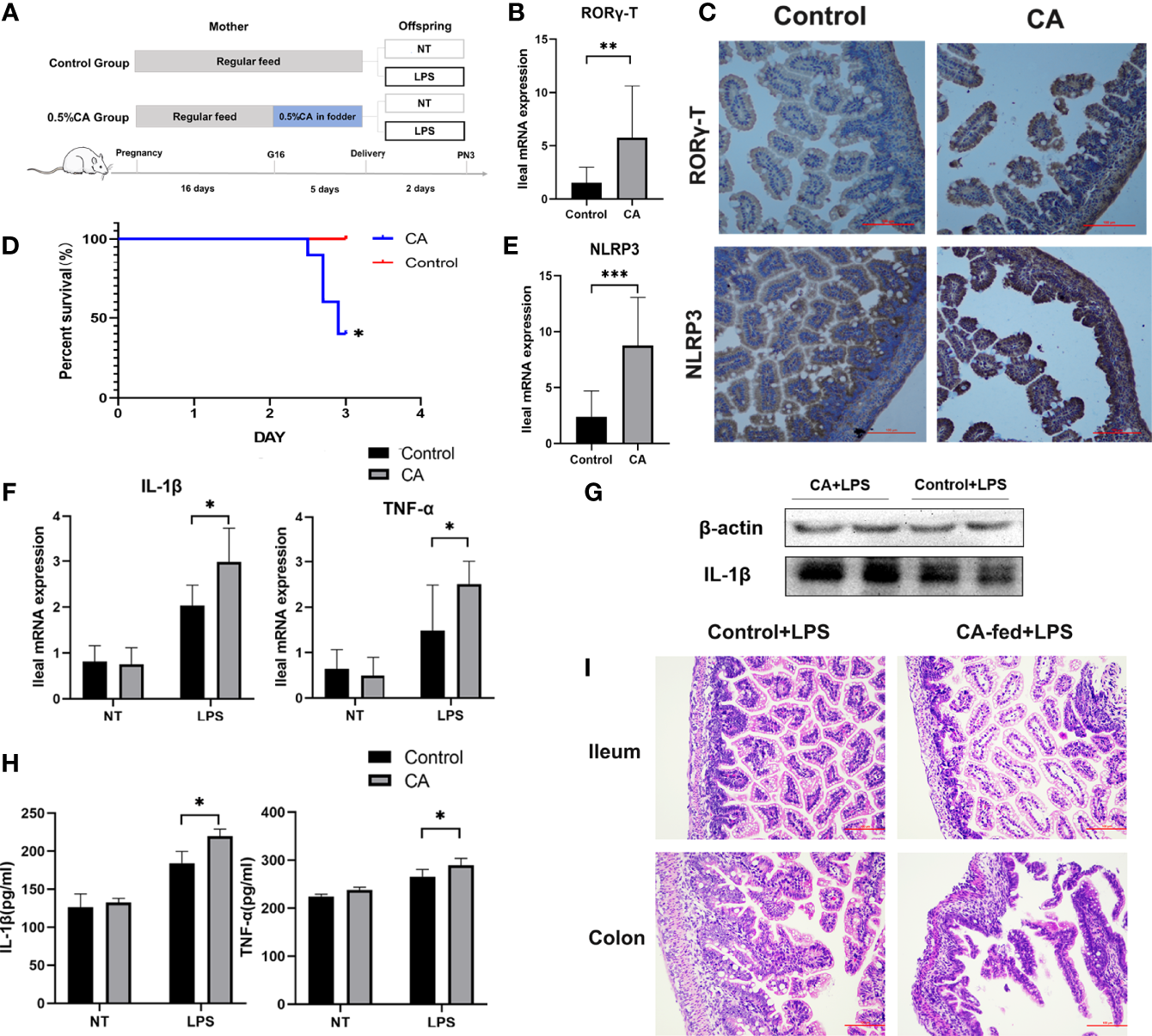 Offspring from CA-fed mothers showed a predisposition to inflammatory disorders. (A) Flow diagram of the experimental procedure. (B, E) Ileum mRNA expression of RORγ-T and NLRP3 in two groups. (C) Immunohistochemical staining for RORγ-T and NLRP3 (brown) in the 1st day ileum tissue section. (D) Survival analyses after LPS exposure. (F) Ileal mRNA expression of IL-1β and TNF-α upon LPS exposure in two groups. (G) Western blot analysis of IL-1β in the ileum. (H) IL-1β and TNF-α serum levels upon LPS exposure in two groups. (I) Microscopic observation of the ileum and colon tissue with hematoxylin and eosin (HE) staining. Scale bar, 100 mm. Magnification, ×200. *p < 0.05, **p < 0.01, ***p<0.001. N =3-6.