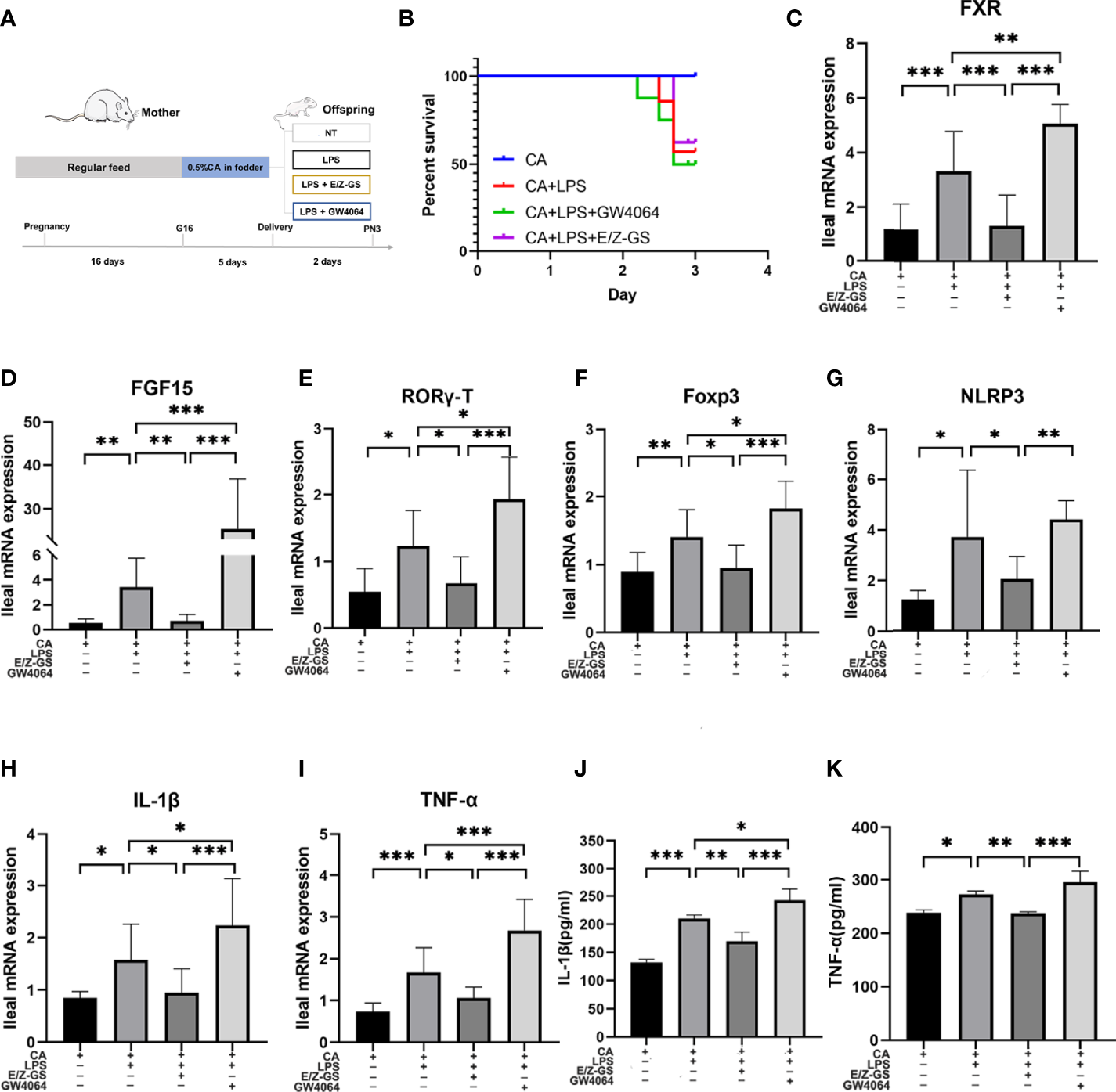 FXR mediates intestinal immune responses to LPS in the offspring from CA-fed mothers. (A) Flow diagram of the experimental procedure. (B) Survival analyses of four groups. (C–I) Ileal mRNA expression of FXR, FGF15, IL-1β, TNF-α, RORγ-T, Foxp3 and NLRP3. *p < 0.05, **p < 0.01, ***p<0.001. N = 5-7. (J, K) IL-1β and TNF-α serum levels in four groups.