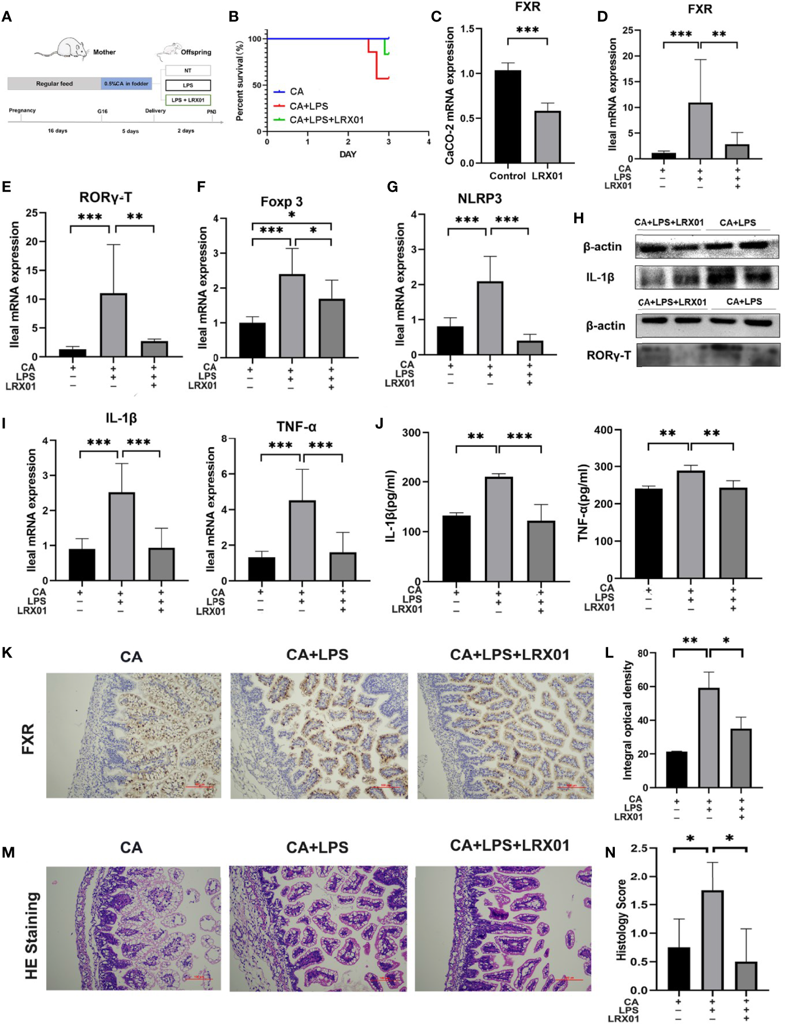 To investigate whether bacteria-mediated inhibition of FXR could improve intestinal immune responses, we treated CA-fed mothers’ offspring with Lactobacillus rhamnosus LRX01 before LPS exposure (Figure 7A), which has been shown to significantly reduce the expression of FXR in Caco-2 cells (Figure 7C) and the ileum (Figures 7D, K, L). As shown in Figure 7B, treatment with LRX01 remarkably reduced the mortality rate and the expression of RORγ-T, Foxp3 and NLRP3 in the ileum (Figures 7E–G, Figure 8). In addition, the ileal mRNA expression and serum levels of IL-1β and TNF-α in the offspring from CA-fed mothers were also improved after LRX01 treatment (Figures 7I, J), the protein levels of IL-1β were also verified (Figure 7H). Histological analysis revealed a marked improvement in epithelial degeneration and decreased histological score in the LRX01-treated offspring (Figures 7M, N). These results indicate that LRX01 supplementation has the potential to reduce susceptibility to LPS exposure in the offspring from CA-fed mothers by inhibiting ileal FXR expression.