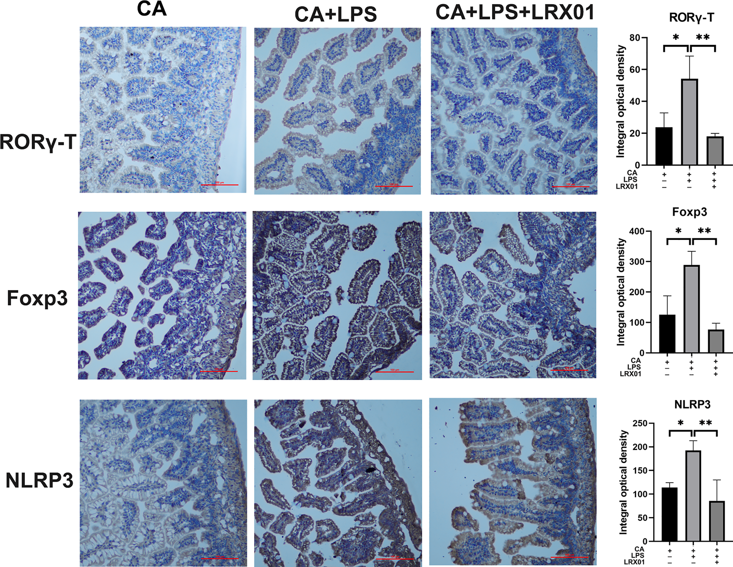 Immunohistochemical staining for RORγ-T, Foxp3, and NLRP3 of ileum treated with LRX01. *p < 0.05, **p < 0.01.