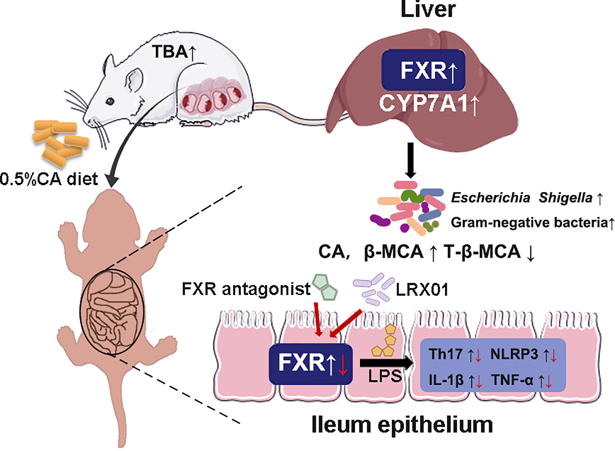Intrahepatic cholestasis of pregnancy (ICP) is a dangerous pregnancy complication that can lead to adverse outcomes in the offspring. However, few studies have investigated how ICP shapes offspring health at an early stage of life. In this study, we demonstratedthat fetal exposure to elevated BA levels in utero in ICP increased the susceptibility of the offspring to inflammation by altering enterohepatic circulation and gut microbiota at an early stage. In addition, we showed that supplementation with Lactobacillus rhamnosus LRX01, which inhibits FXR expression in the ileum, has the potential to reduce susceptibility to LPS exposure in the offspring from CA-fed mothers (Figure 9).