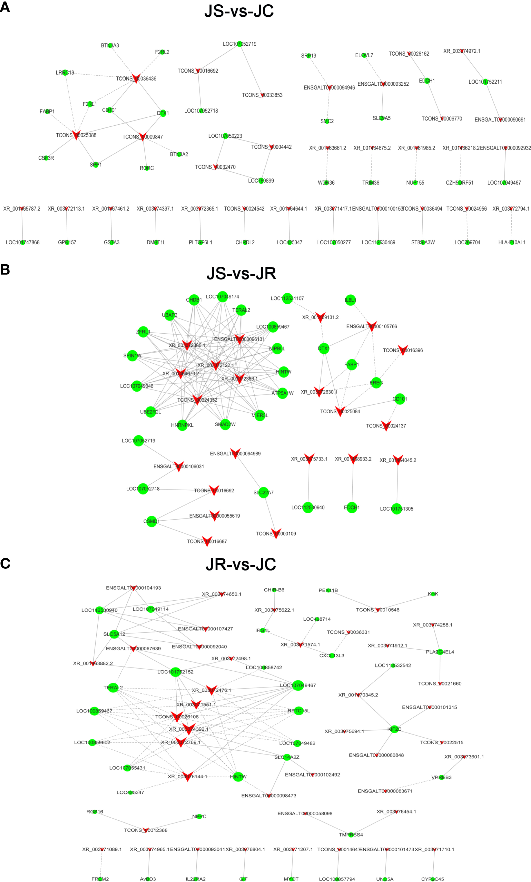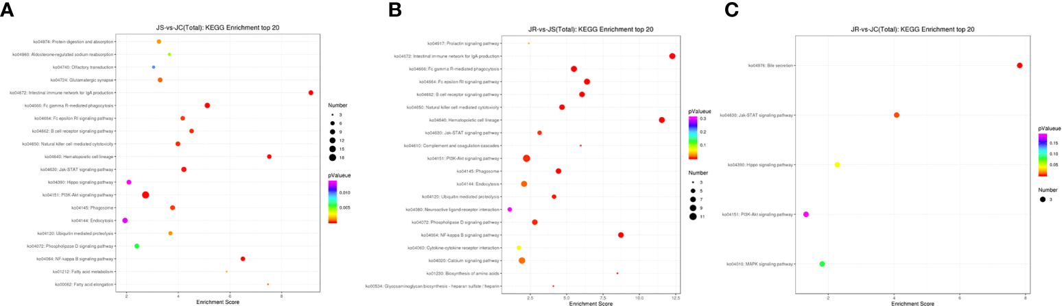 To predict the potential functions of these differentially expressed lncRNAs, GO terms and KEGG pathways enrichment were analyzed according to the neighboring genes of the differentially expressed lncRNAs. The GO analysis results showed that the top 30 terms enriched in the JS vs JC groups mainly included bacterial defense response, circulating immune complexes and antigen binding. Similarly, the immune response, B cell receptor signaling pathway and immunoglobulin receptor binding were significantly enriched in the JS vs JR groups, while signaling receptor binding and transcription factor binding were significantly enriched in the JR vs JC groups (Figure 4; Supplementary Table 2).