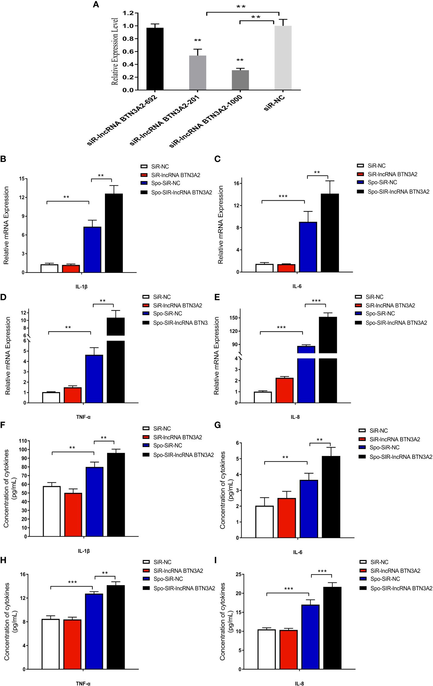 Chicken DF-1 cells were inoculated in a 12-well plate and grown to 70%. Then, the cells were subsequently transfected with 20 µmol/L siRNA or negative control, 0.8 µg/µl pcDNA3.1-lncRNA BTN3A2 and pcDNA3.1 using jetPRIME Transfection Reagent (Polyplus, Illkirch, France) for 24 h and then stimulated with sporozoites for another 6 h. The cells were harvested for RNA extraction, and the suspension was collected for ELISA.