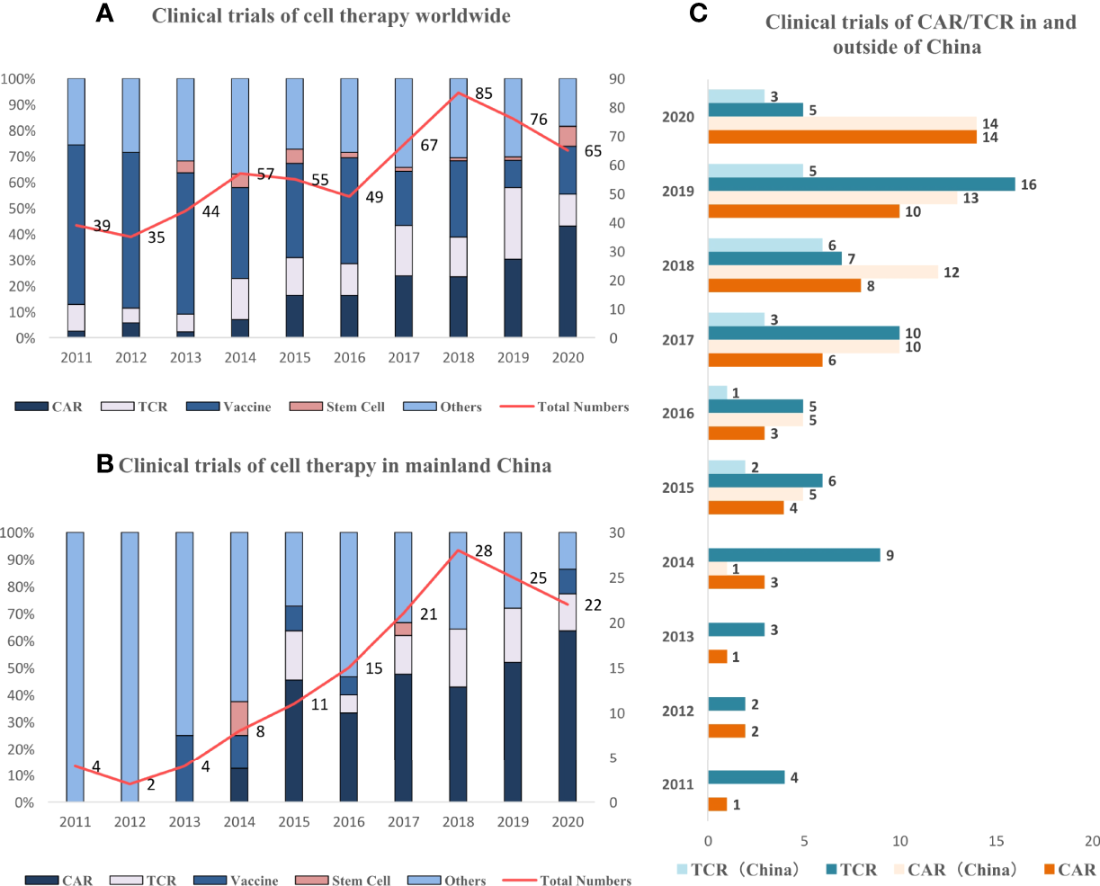 Trend of clinical trials on cell therapy worldwide and in China. (A) Newly initiated active clinical trials on cell therapy have increased especially after 2014, and the dominating type is converting from vaccine to CAR/TCR-T. (B) Newly initiated active clinical trials in China continue to increase since 2015, and the dominating type is CAR/TCR. (C) Newly initiated active clinical trials increase both in and outside of China (since 2015).
