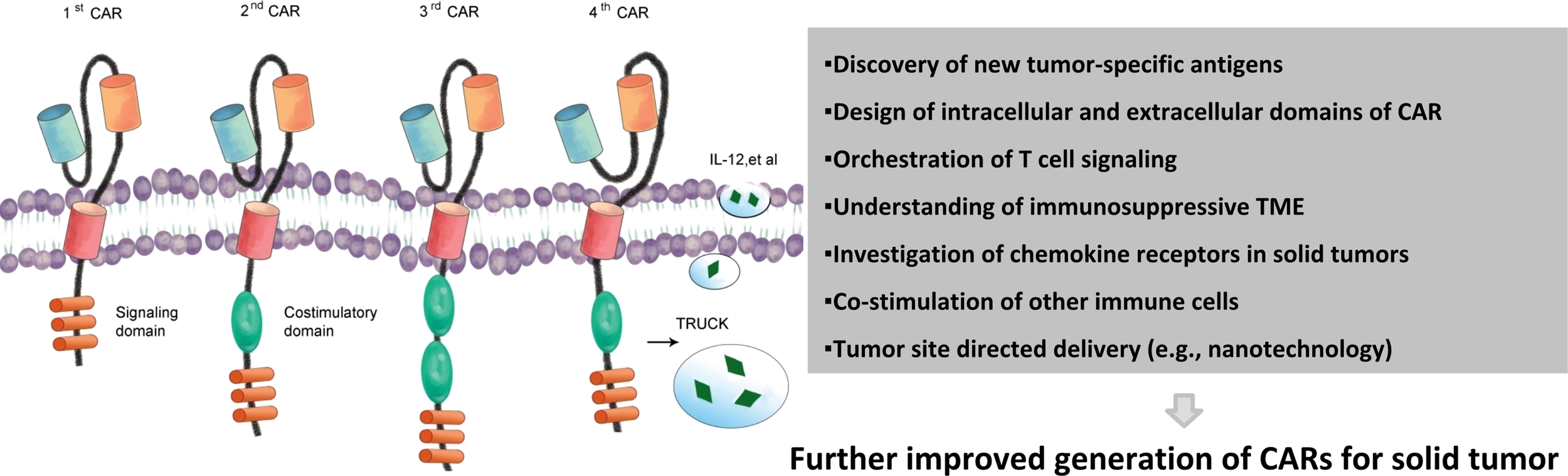 Chimeric antigen receptors and main challenges of treating solid tumors. Evolution of CAR from the first generation to the fourth generation. First-generation CARs. Second-generation CARs embody an additional intracellular signaling domain to the first-generation receptor configuration and provide a co-stimulatory signal. Third-generation receptors incorporate two co-stimulatory domains with the T-cell-activating signaling domain. Fourth-generation CARs or TRUCKS (T cells redirected for universal cytokine killing) carry vectors that encode a CAR and a CAR-responsive promoter as well as respond to the successful signaling of CAR by the transgenic production of cytokines such as IL-12. Upon accumulated knowledge of solid tumors and their surrounding environment, more effective CAR therapeutic products may be generated. CAR, chimeric antigen receptors.