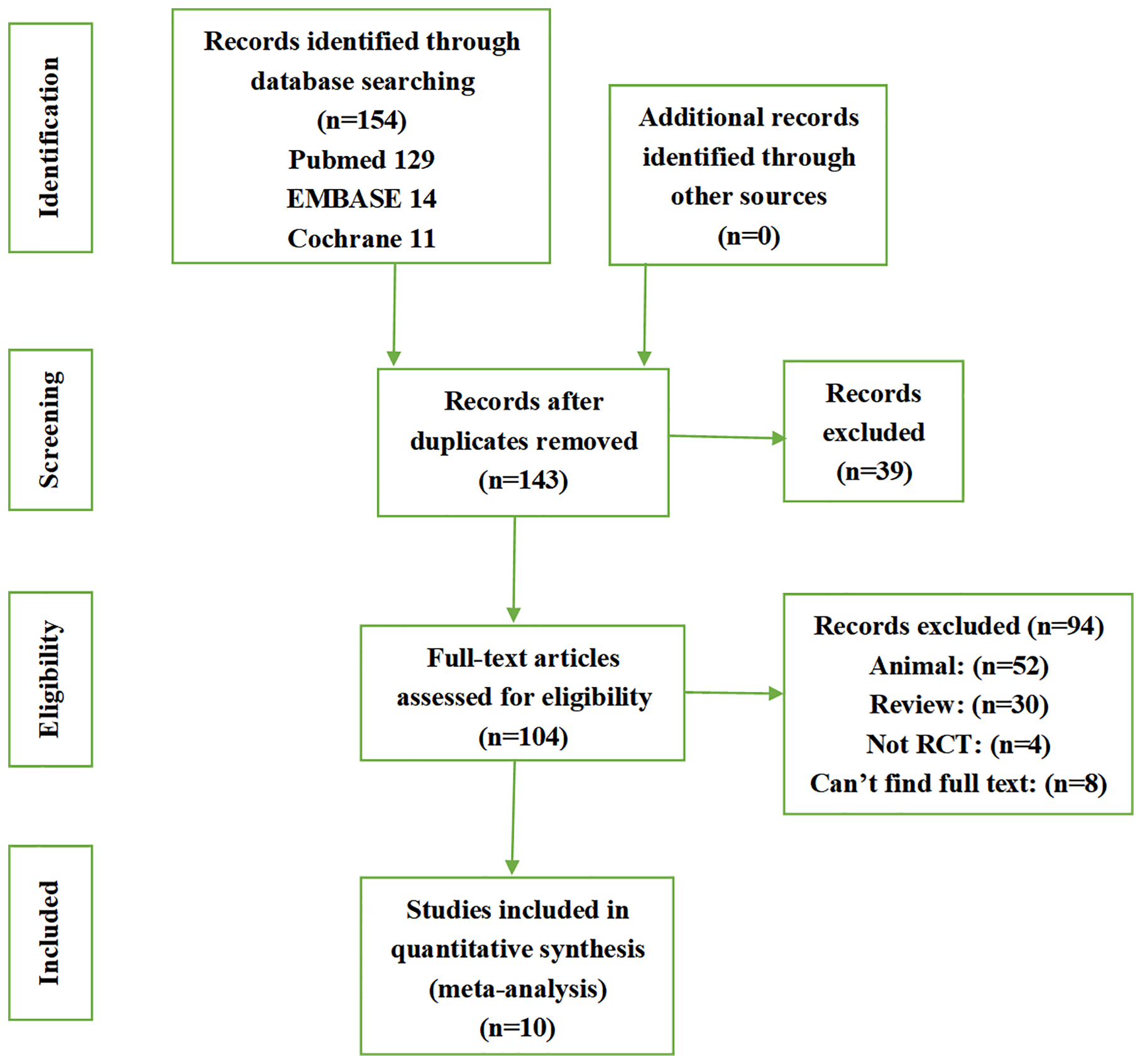 In total, 154 articles were retrieved, including 129 from PubMed, 14 from Embase, and 11 from the Cochrane database. All of the retrieved articles were imported into Endnote, with 11 duplicates found. A closer look at the titles and abstracts revealed 30 reviews and 52 animal experiments. Full-text review identified four articles that were not randomized controlled trials, and the full text could not be found for eight articles, likely because the clinical study had not been completed. Finally, a total of 10 studies were included in the analysis, including two studies using allogeneic stem cells to treat IUA (13, 14) and eight studies using autologous stem cells to treat IUA (15–17, 20–24). The flow chart of the search process is shown in Figure 1.