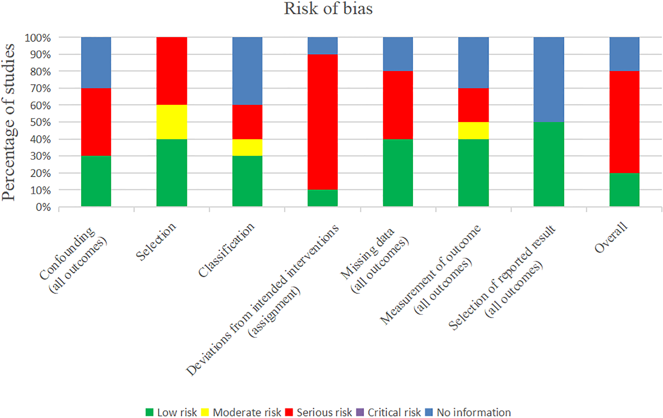The ROBINS tool was used to assess the methodological quality and risk of bias of the included trials according to the following eight areas: confounding factors (all outcomes), selection, classification, deviations from intended interventions (assignment), missing data (all outcomes), measurement of outcome (all outcomes), selection of reported result (all outcomes), and overall (19).